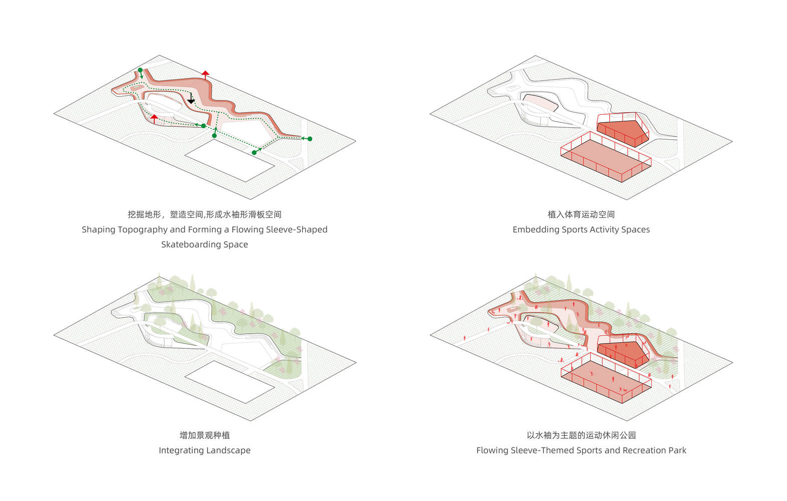 项目的核心设计理念源自昆曲水袖的灵动飘逸,通过空间塑造与材质运用,将这一富有东方韵律的意象转译为现代都市语境下的景观体验。水袖的抽象形态被巧妙地融入公园地形,形成连续流畅的运动空间,并在不同功能区域之间建立有机联系。这一设计策略不仅赋予场地独特的文化意象,同时增强了空间的可读性与互动性。