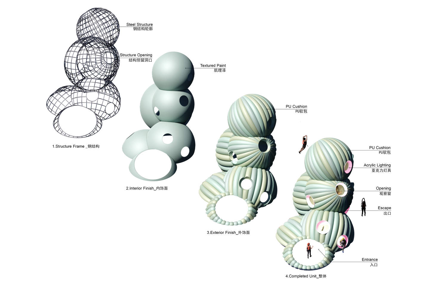 设计重点:我们通过四个主要设计元素将建筑装置和运动设备整合构建一个探索空间。Barrel Cactus (Echinocactus): By utilizing the spatial relationships between seven spherical forms, we transform the interior into a large-scale exploration tool that allows family members to exercise climbing and crawling abilities. The internal structure arrangement inside the barrel-shaped spheres is a networked structure projected onto the sphere's surface. Where necessary, additional independent columns are used to support the internal play, and the periphery of the barrel can also be explored, so the exploration process also forms an additional activity.