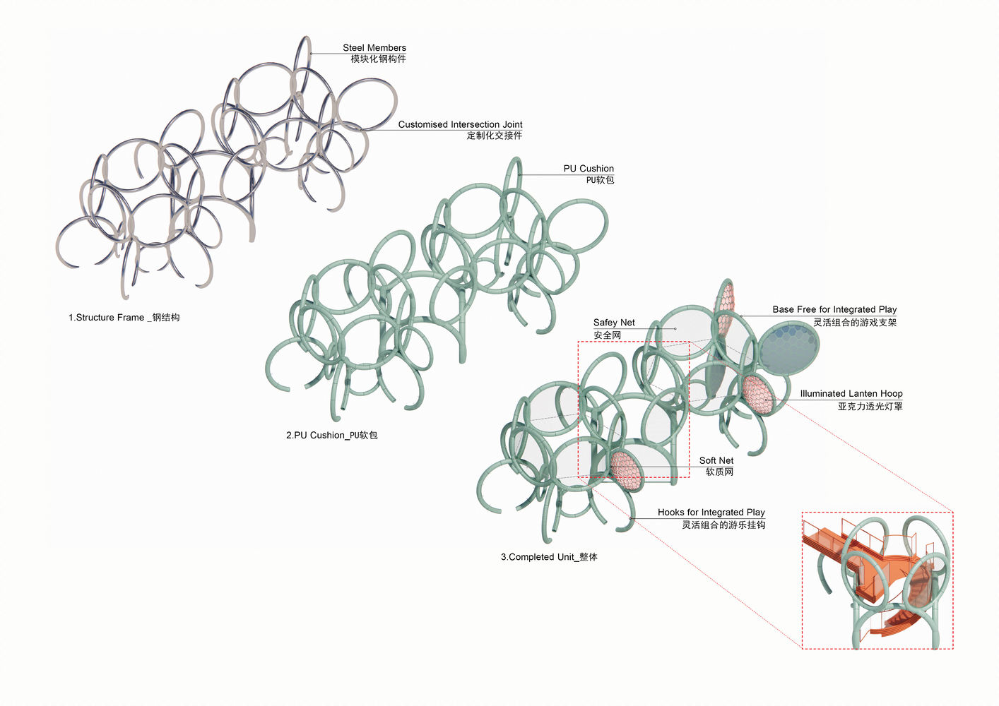 仙人掌:我们优化了仙人掌的结构形态,并参考了细胞结构中发现的空间关系。利用直径为4.14米和3.1米的28个圆环,构建两个对称的空间结构,每个环都以径向方式排列。采用预制的钢管段构建框架,通过焊接固定并覆盖缓冲材料,每个环分为12个段。在这个环形框架上,我们加入了水平攀爬网、滑梯、高空训练元素和装饰性照明。它作为空间内的主要框架,支撑和定位主要的垂直游戏设施。