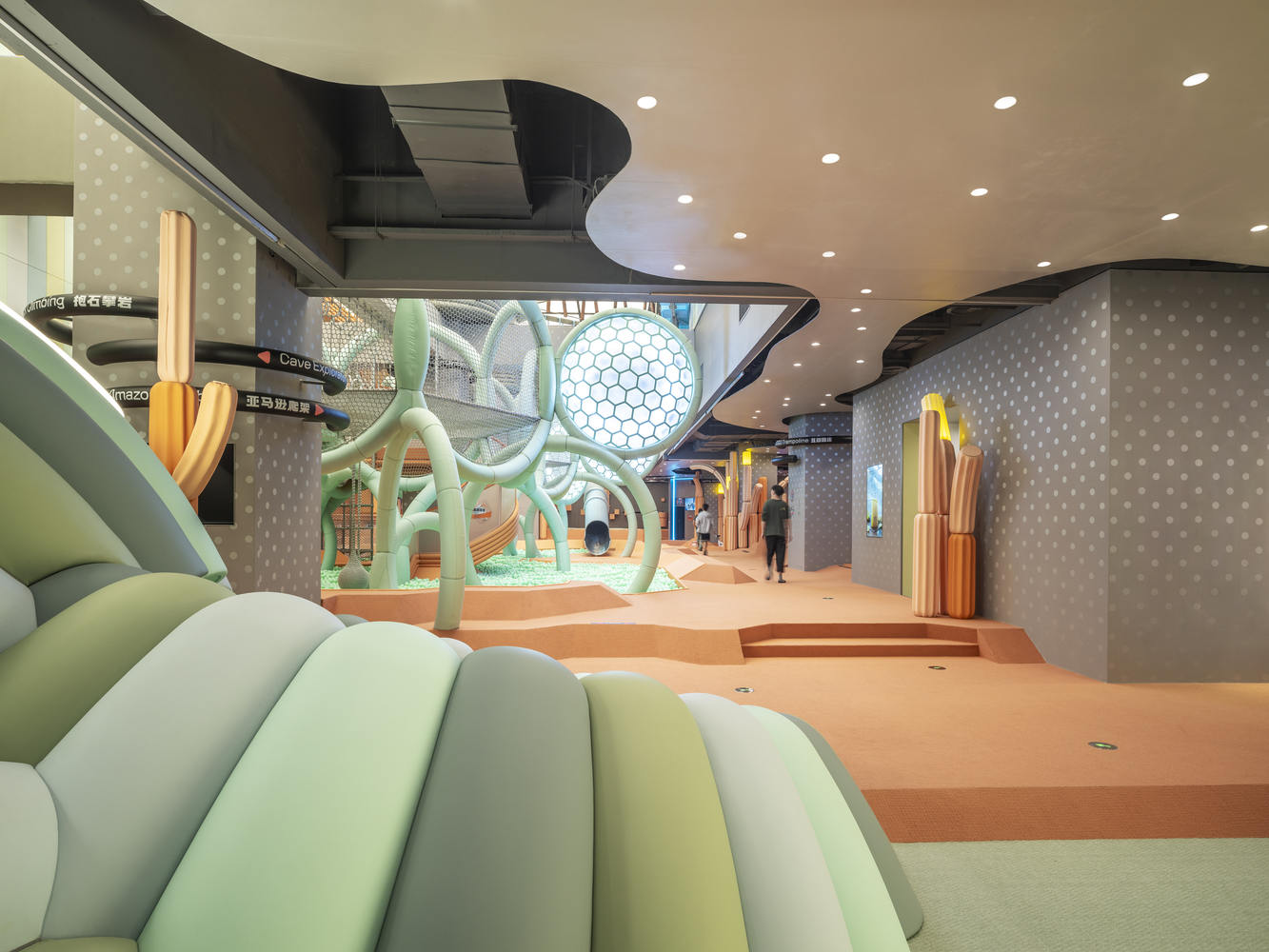 © 田方方Cactus (Carnegiea): We optimized the structural form of the cactus, referencing spatial relationships found in cell structures. Two symmetrical spatial structures are built using 28 rings with diameters of 4.14 meters and 3.1 meters, with each ring arranged radially. Prefabricated steel pipe sections are used to build the frame, fixed by welding and covered with cushioning material, with each ring divided into 12 segments. Horizontal climbing nets, slides, high-altitude training elements, and decorative lighting are added onto this ring frame. It serves as the main framework within the space, supporting and positioning the primary vertical play facilities.