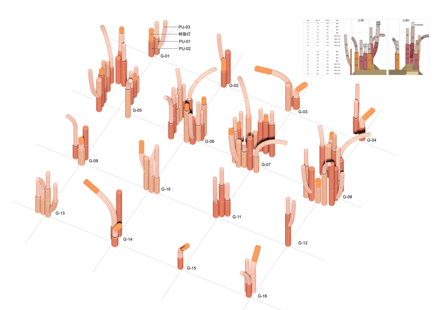 细节详图Dune Topography: The topography of the entire venue floor is designed in the shape of sand dunes. We use trapezoidal standard blocks, measuring 450x450mm, to abstract the form of sand dunes. By stacking and arranging these standard modules in three dimensions, the ground is transformed into a basic physical obstacle training area. Combined with the hollow and protruding areas formed by the different shapes of the cacti, a complete sports venue is created.
