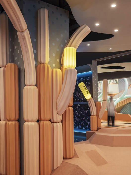 © 田方方Saguaro Column (Opuntia): Utilizing the vertical form of the Saguaro column, it is uniformly distributed throughout the space as a furniture element. Padded modules protrude from the furniture and are used as design tools to support intuitive play functions, including climbing points, swinging arms, and steps, or higher observation points. As a planning tool, the Saguaro columns can be used to divide elements between different zones, serve as a visual navigation system, and implement functional lighting fixtures through a single modular element.