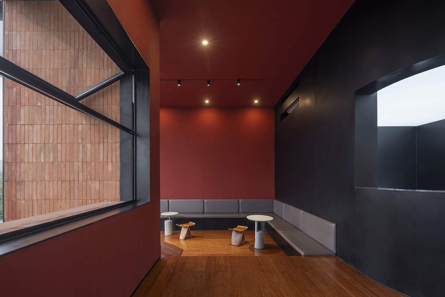 The black core in the middle is the service space for the entire building, integrating bar service and HVAC equipment. When it extends to the second floor, it becomes very narrow, allowing light to enter through the skylight, forming a wrapped, meditative space. Exiting through the corridor behind the service desk leads to the external staircase to the second-floor terrace of the building. The entire second-floor terrace is composed of "windows" at different angles, framing different landscape effects by opening windows from all directions.
