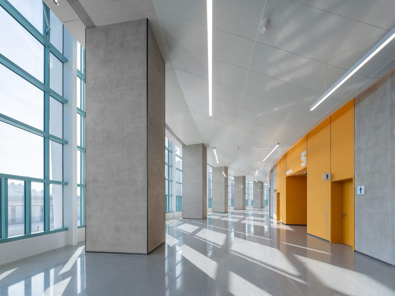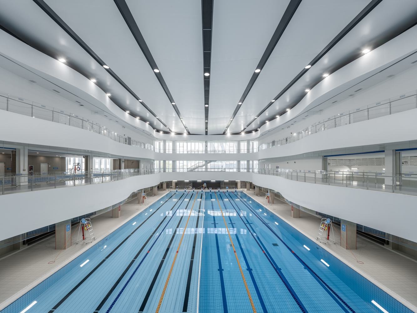 The facade of the Shanghai Gymnasium retains and continues the original architectural elements, while the interior undergoes structural reinforcement. The renovated interior space of the gymnasium allows for quick field division and switching, serving not only as the home court for the Shanghai basketball team but also hosting various performances and commercial activities. After renovation, the Shanghai Natatorium was transformed into a "Citizen Water Sports Center" open to the public. The original closed wall at the end of the standard pool was transformed into a floor-to-ceiling glass curtain wall, introducing natural light. The facade renovation of the Dongya Building extracts imagery elements from the white magnolia, the city flower of Shanghai, and the torch, an element of sports.