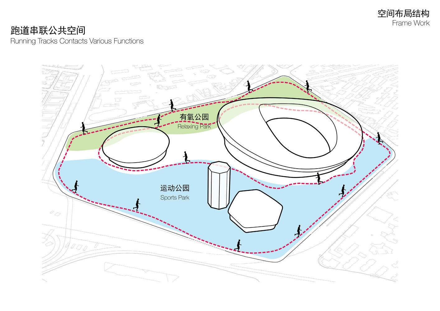 “一轴两翼加环形跑道”的创新空间组织:HPP提出的“一轴两翼加环形跑道”布局是解决原有交通混乱、空间消极问题的核心策略。将原有专业赛事功能聚焦于“东西向专业赛事轴”,明确了核心功能导向。更具匠心的是“两翼”的划分,创造了南北两大主题公园,极大地增加了城市绿量和活力空间。双圈跑道的设计更是高明之举,内圈服务于场馆间的快速连接,外圈则融入城市肌理,有效改善了步行体验,将体育活动自然地渗透到城市日常生活中。