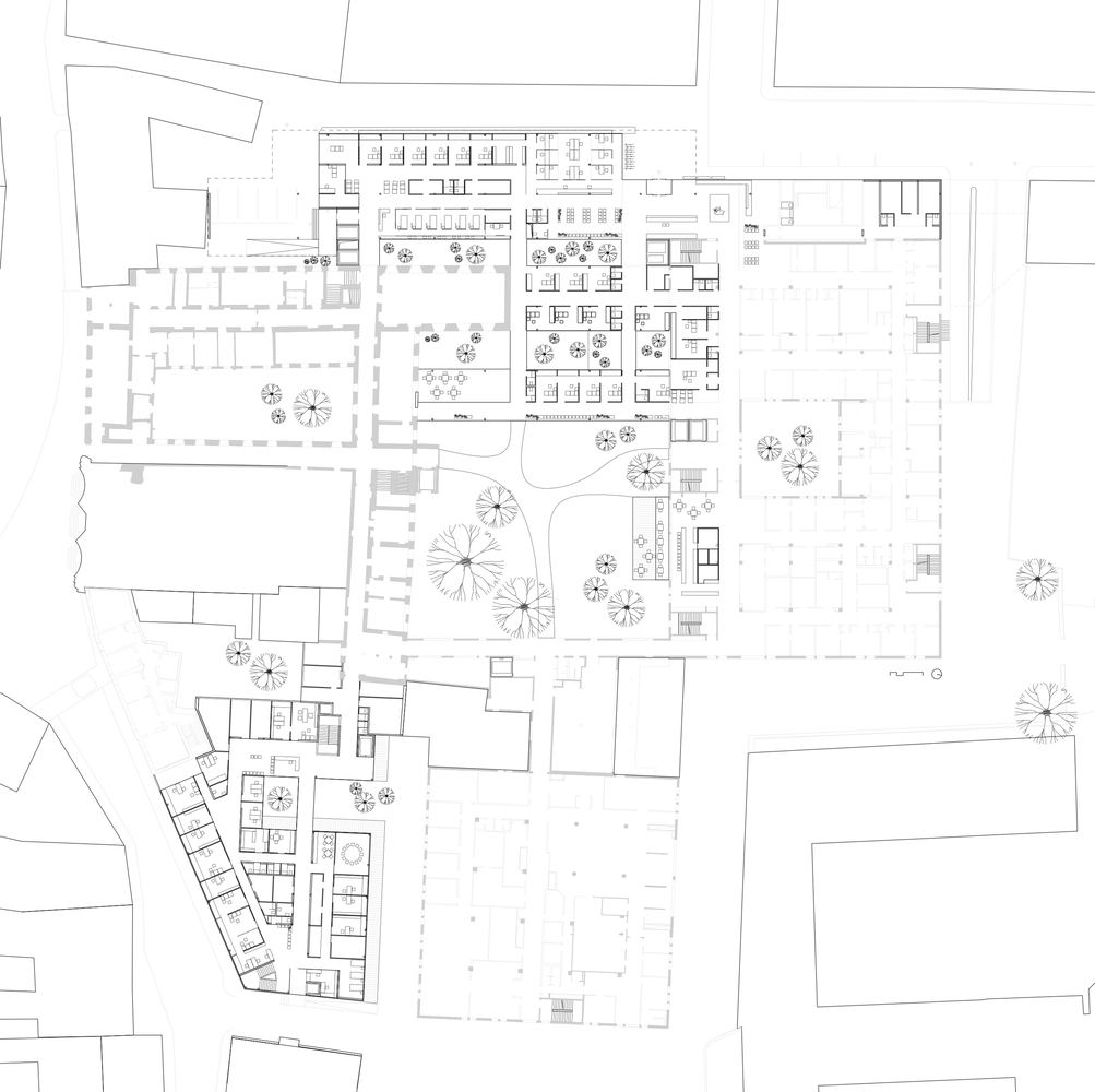 这些改造措施中最具有代表性的就是添加了两大部分。通过创造一个连贯、宽敞的内院,将各种建筑元素连接成了一个大的整体,使原本从城市规划和建筑角度来看不尽如人意的局面得到了改善。庭院得到清理,一个线性的建筑结构也被设计出来,以一种特定而精确的方式与现有的建筑关联。