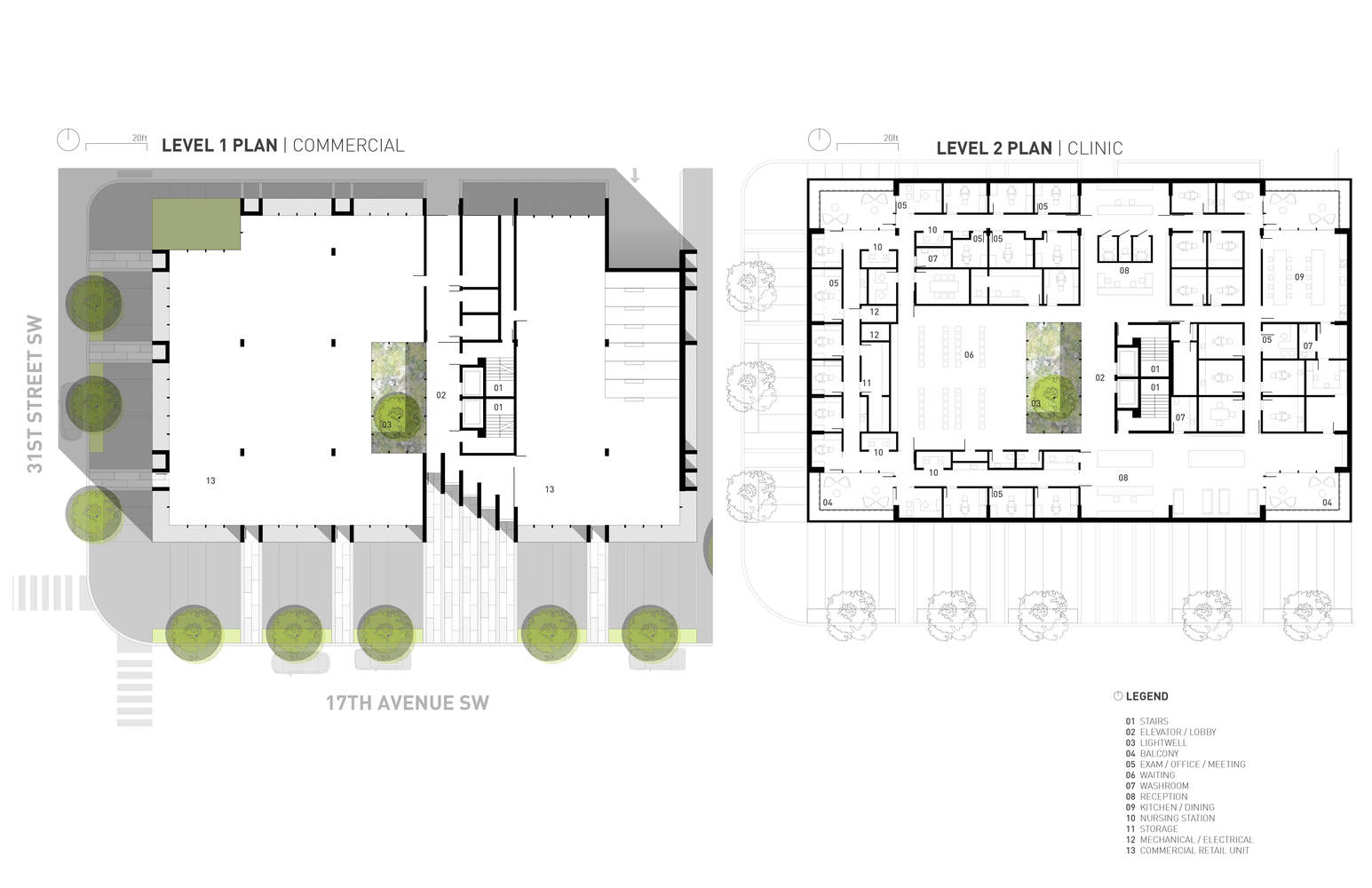 由于皮肤病诊所需要大量柔和的自然光来对患者进行检查和治疗,建筑师在分析了这个主要的功能后,表明了二层的各种流程和程序中光线调节的重要性。