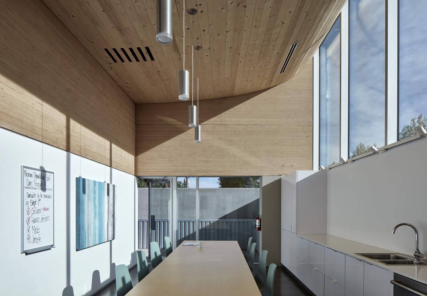 The top floor of the building features a series of light-filled spaces defined by a system of timber beams. This timber beam system also provides acoustic separation between rooms. This grid system resolves many of the building’s functional requirements. It functions as a roof structure, enabling large spans and uninterrupted floor plates. Additionally, it creates a sense of intimacy through a 7-foot threshold, a feeling experienced whenever passing under the 'egg-nest' structure. The grid also provides a surface for diffusing light through natural materials, creating a warm and serene glow.
