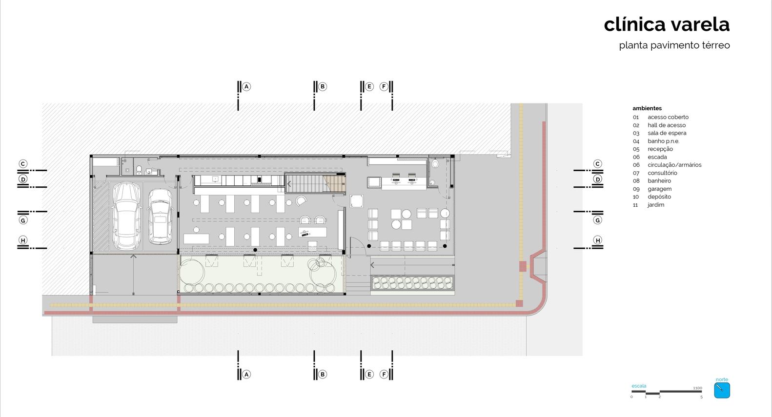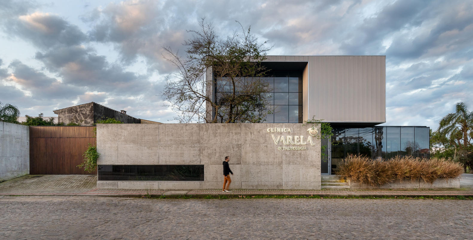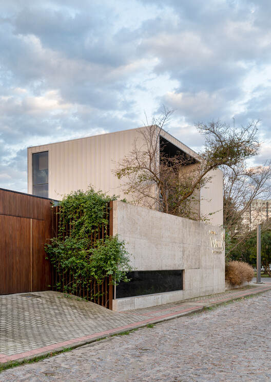 The new headquarters for Varela Clinic, located on a small corner lot, is composed of two linear levels, organizing the required functions into units differentiated by materials, based on the owner's desire for an iconic and timeless building.