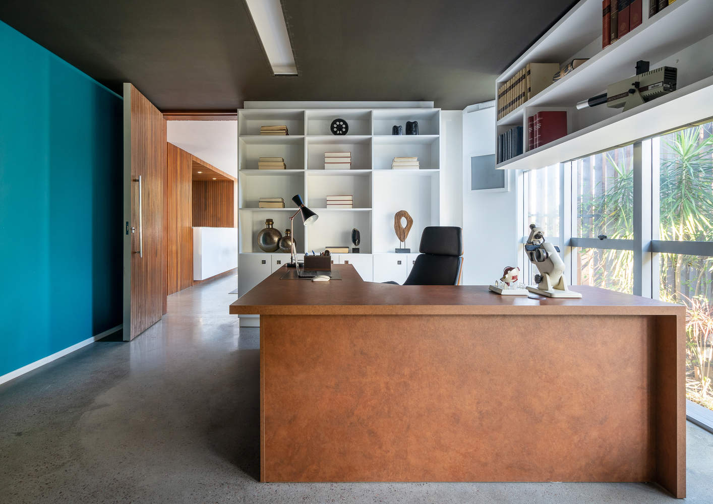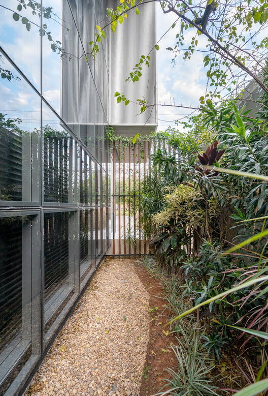 Inside, a wooden cube organizes the spaces and conceals the main functional space of the project—the ophthalmology clinic. The offices open onto a garden defined by exposed concrete gables and vertical wooden slats positioned along the building's perimeter. Besides its landscape function, the garden merges the offices with the exterior, providing privacy and acoustic protection to the spaces. Light control required for professional activities is provided by automated curtains.