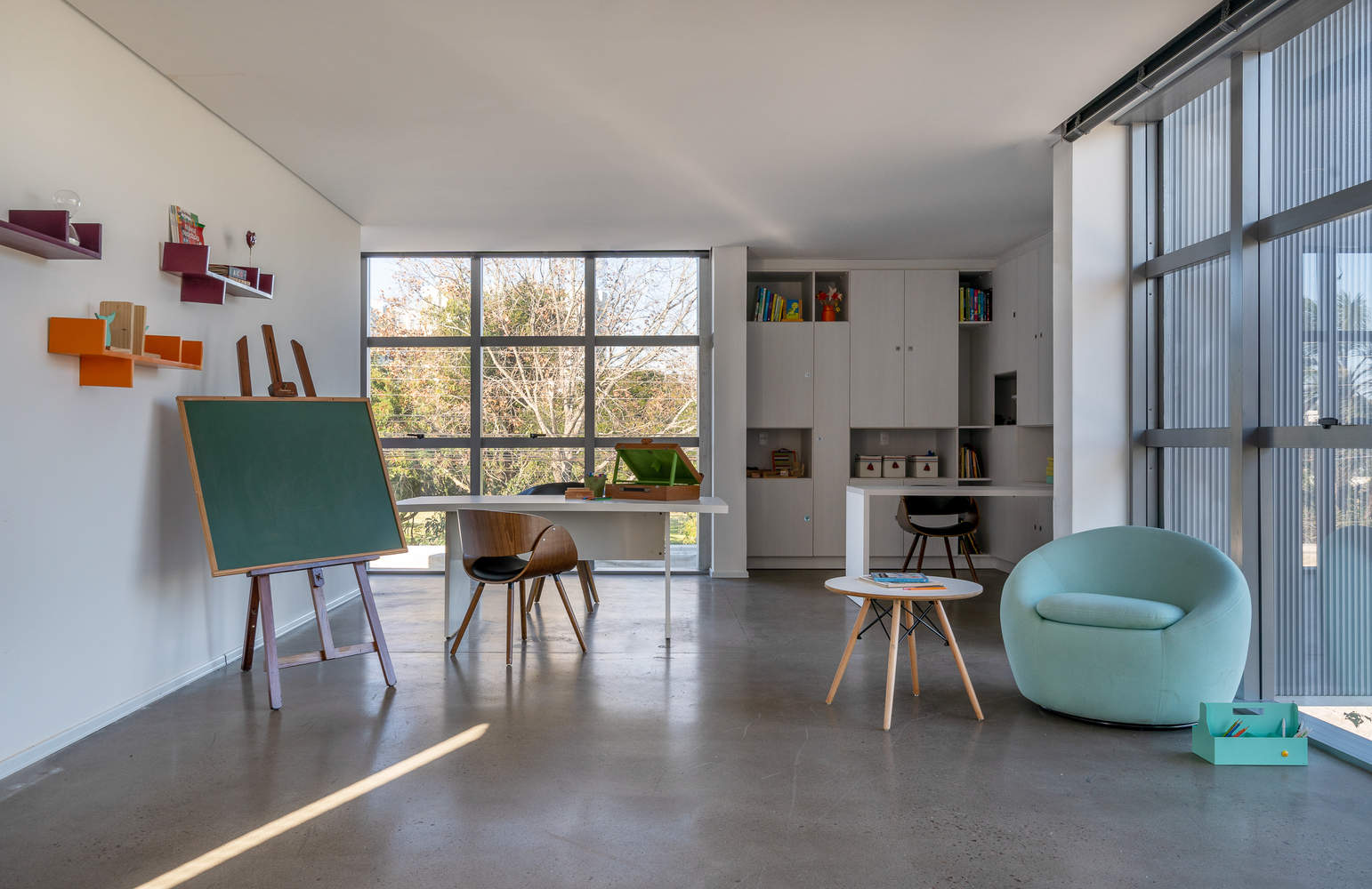 The staircase, resulting from the subtraction where the cube intersects, leads to the psycho-pedagogical offices on the upper floor. The unit, characterized by a metal coating, cantilevers over the ground floor volume, offering the best possible view of the surroundings through the arrangement, combination, and dissolution of prismatic blocks.
