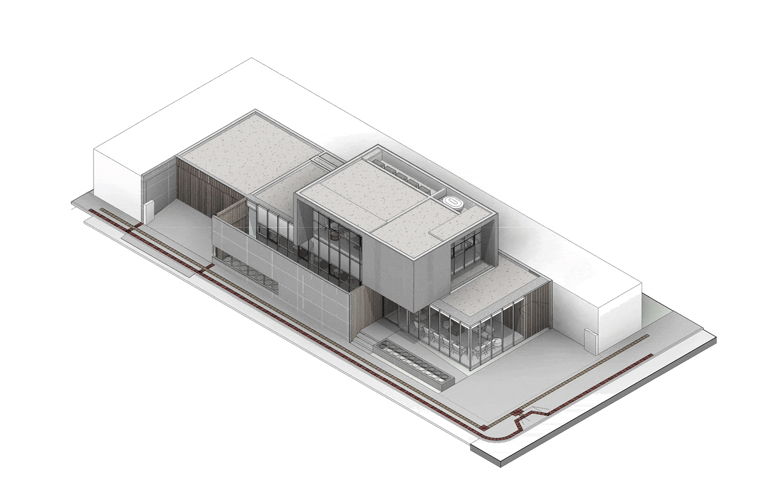 地块策略与永恒的建筑表达:项目巧妙地利用了其位于城市拐角的狭小地块,通过两层线性布局和不同材质的体块划分功能。这种策略不仅响应了业主对“标志性”和“永恒”建筑的诉求,更在有限的空间内实现了高效的功能组织。建筑师通过体块的组合、悬挑与消解,成功地在密集的城市肌理中创造了一个既具有辨识度又融入环境的现代诊所形象,体现了对场地敏感性的深刻理解。