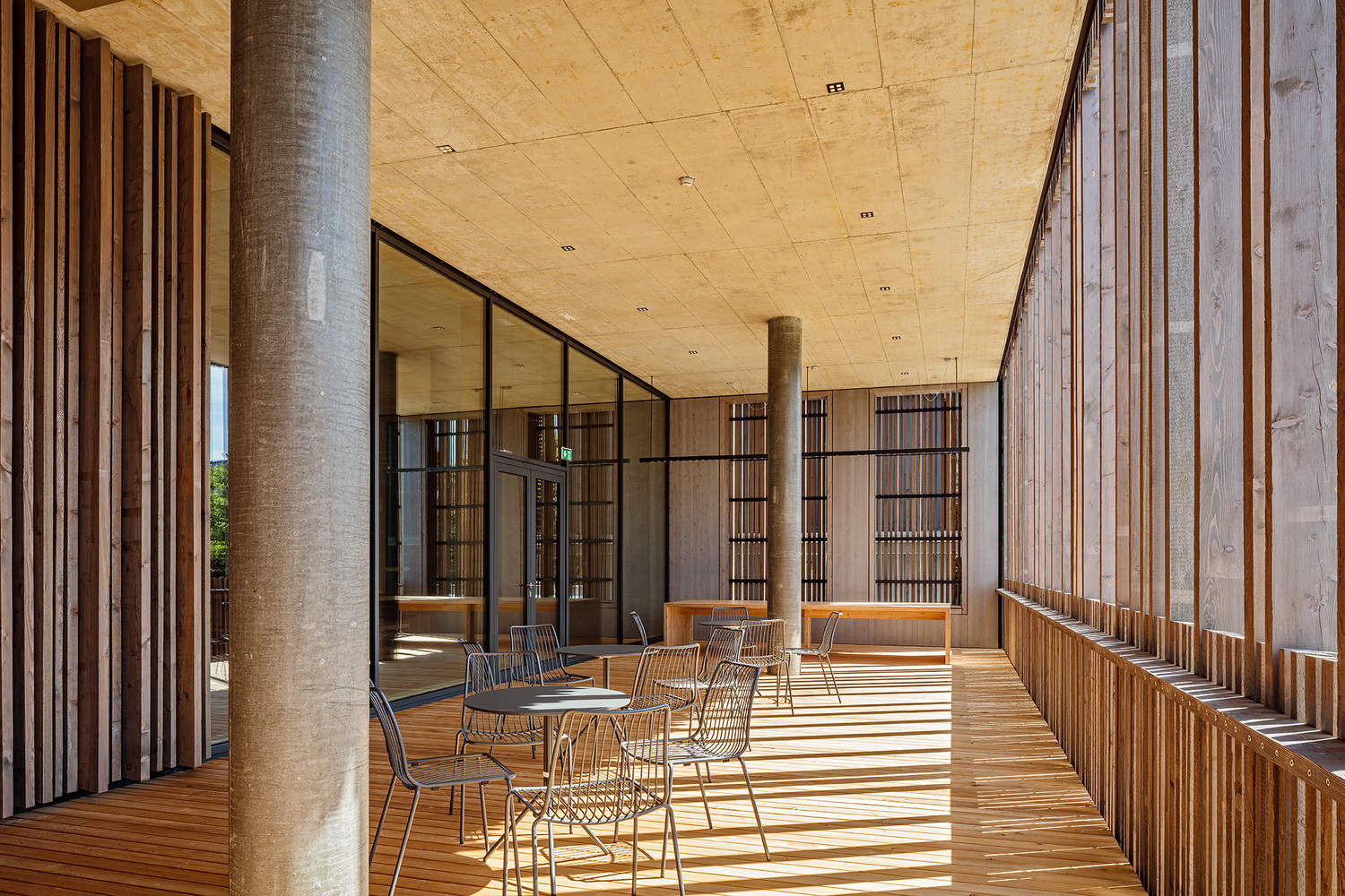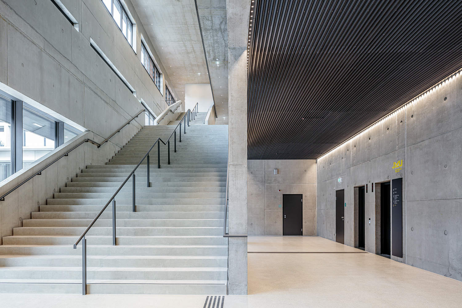The idea of the campus is to promote research, exchange, and communication. Classrooms and research rooms, offices, the library, cafés, supermarkets, and shops are mixed around an open campus, creating a lively, attractive urban atmosphere. 1,800 students and 250 professors and researchers will study, teach, and research in this 12,500-square-meter building.