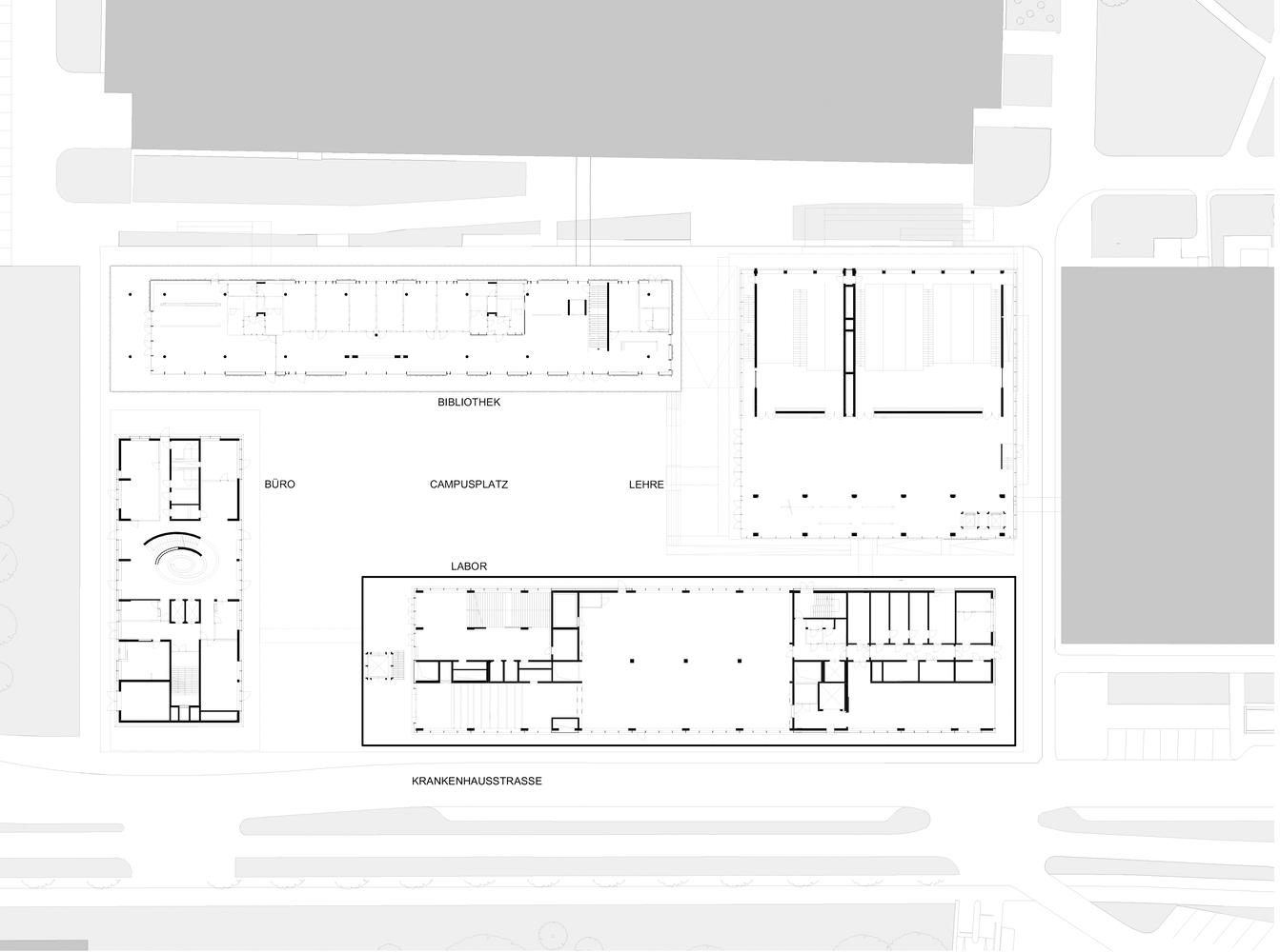庞大的建筑体量由四个建筑结构组成,围绕着一个共同的广场。四个主要功能,演讲厅、实验室、办公室和图书馆,将分别容纳在一个建筑中。分成四个独立的建筑是为了给不同功能制定最佳的空间、技术和设计方案。从外部看,这些建筑在综合医院、献血中心、医院道路和公园之间形成了一个紧凑的建筑群。