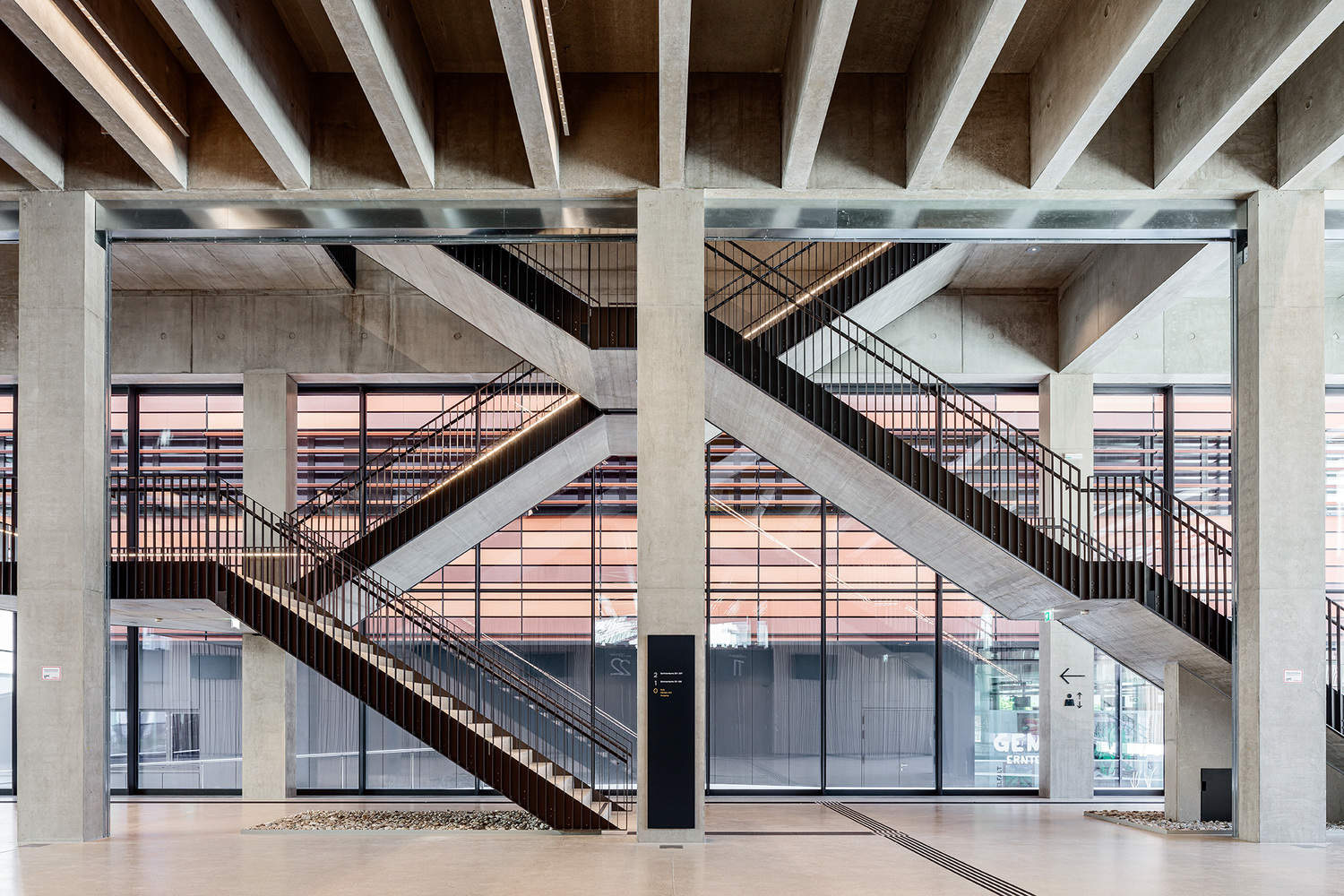 结构分层与空间体验的精妙处理:在宏观尺度上,项目通过划分出容纳不同核心功能的四个单体建筑,确保了各个功能(演讲厅、实验室、办公室、图书馆)都能获得最优化的空间和技术环境。在微观体验上,设计层次丰富,从围绕广场的公共底层到具有象征意义的行政楼顶层空中酒吧,空间序列引导清晰。这种结构上的清晰划分和体验上的层层递进,为1800名学生和250名科研人员提供了一个舒适、现代且极具启发性的高品质学习和研究环境。