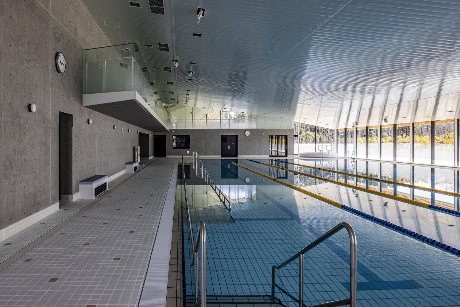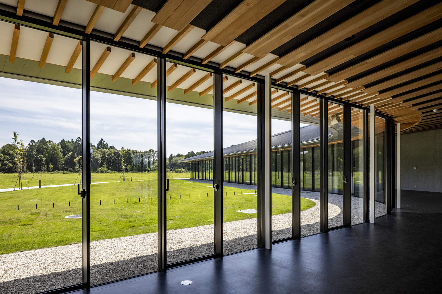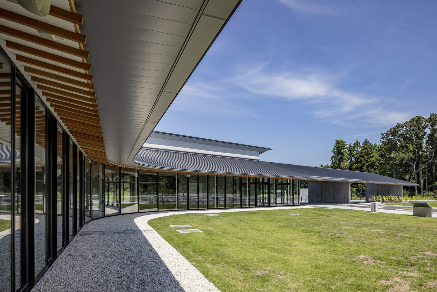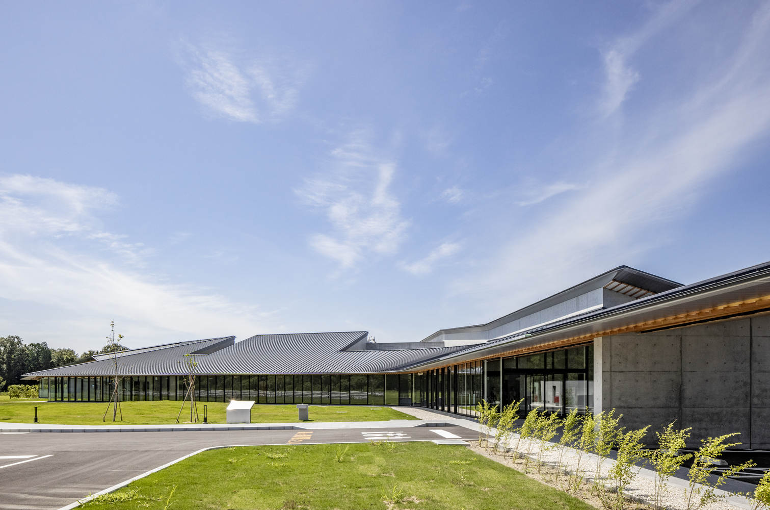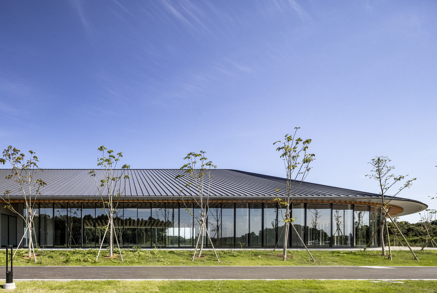 By linking these functions in sequence, a continuous space was created. We aim to promote communication among people who come to exercise, making this a place where everyone can happily gather. To allow this ribbon-like space to coexist and integrate with the surrounding mountain forest and rural landscape, we installed a low, continuous yet non-monotonous single-slope roof. This interconnected body, composed of straight lines extending in different directions from the building’s recessed parts and reflective triangular roof surfaces with varying depths and slopes, echoes the various interlocking combinations of interior functions. The eaves of the building remain horizontal, giving it a traditional Japanese appearance by lowering the height. The ceiling, which has the same style as the underside of the eaves, expresses the continuity from the eaves to the interior space. The exterior walls are mainly enclosed by glass curtain walls, creating a visual effect where the ceiling extends outwards, demonstrating a Japanese style that blurs the boundaries between the interior and exterior spaces.