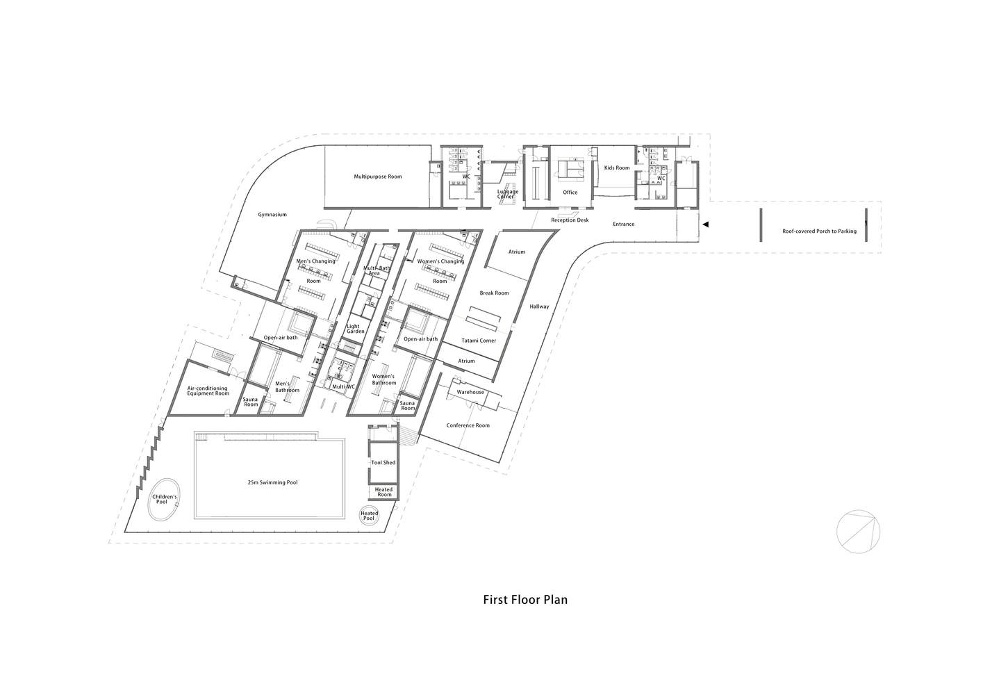 场地位于距水户市中心较远的东部丘陵地带。该地经过清理杂树林、填埋谷地后整合而成。为了避免将建筑建在异种基础结构之上,我们在寻求直接基础的过程中逐渐浮现出这个带状形态,从而决定了该建筑的布局与外形。本案的建设目的在于为社区提供娱乐休闲的场所,减轻未来要在附近建造垃圾焚烧厂与火葬场而给居民带来的心理负担。其内部主要有健身房、多功能练习室、室内泳池以及桑拿洗浴等功能。