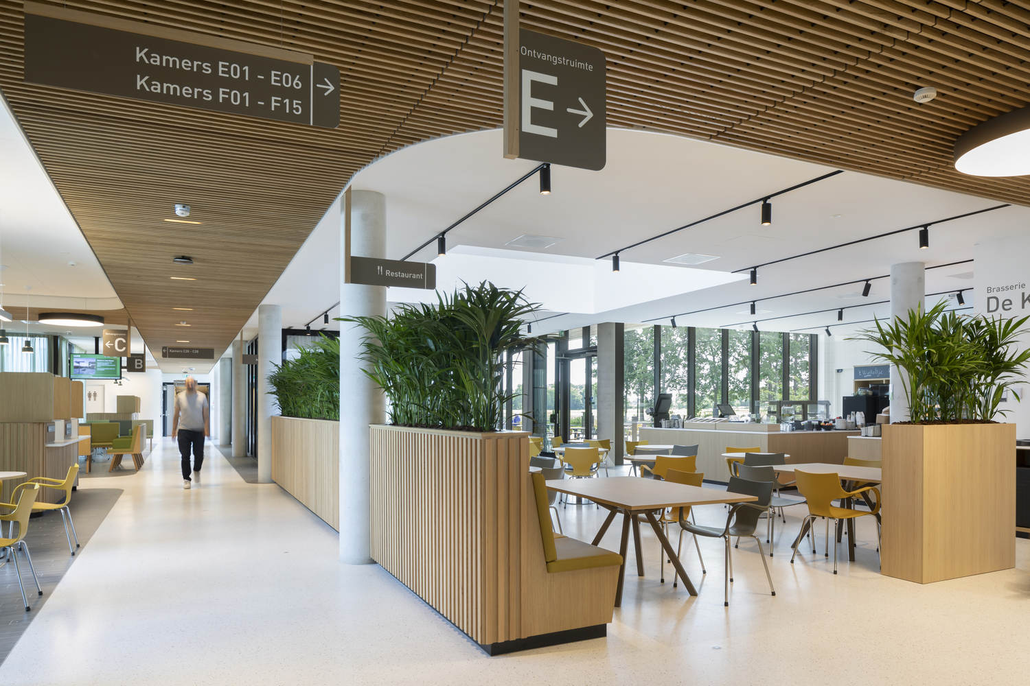 The hospital (Isala Diaconessenhuis) is not only highly innovative in its spatial organization and architectural expression but is also the first fully electric medical facility in the Netherlands. The roofs of the two higher volumes are covered with solar panels, and the building has a thermal storage system. Furthermore, the hospital shows maximum respect for its surroundings: the landscape is mainly shaped with native local vegetation, the existing storks continue to thrive here, and the green roof ensures biodiversity. Together, these elements result in a sustainable healthcare building where humans and nature coexist harmoniously.