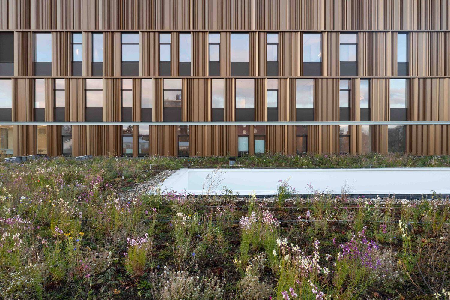 Since the building is mainly spread out horizontally, natural colors and materials are used on the facade, and the green roof design ensures that the hospital blends perfectly with the natural environment. The corrugated aluminum panels on the facade exhibit different light and shadow effects over time, making the building's exterior change with the time of day and the seasons. The protruding canopies emphasize the horizontality of the building while blocking solar radiation.