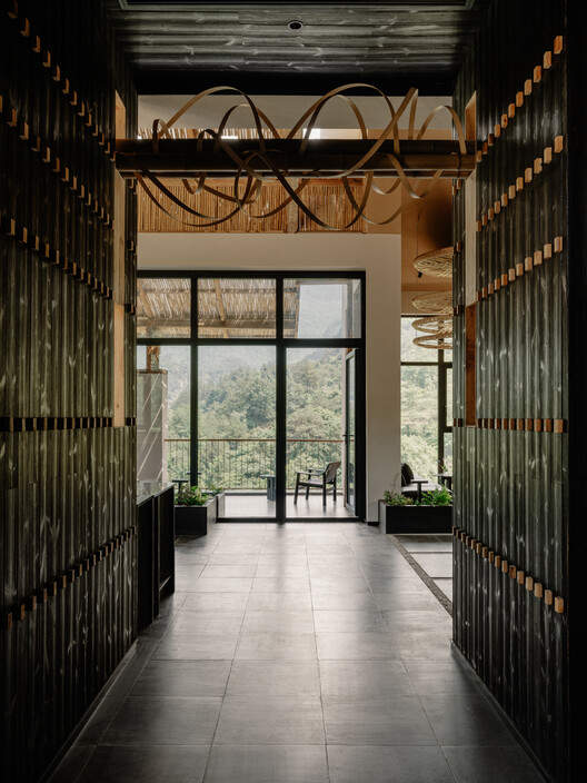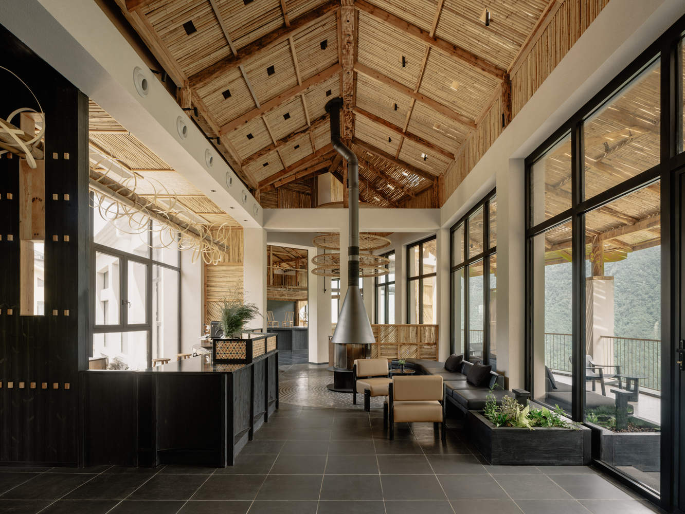 大堂层设置于建筑顶层,串联入口接待、等候区、电梯厅、酒吧、多功能戏台与办公夹层,全向山景展开。室内以竹笋壳、方竹、废旧木、竹编及黑色山石等填充空间,使访客进入后即感受到山体包裹般的体验。大堂吧的竹构与竹画为现场即兴创作,形成独特的空间气质。