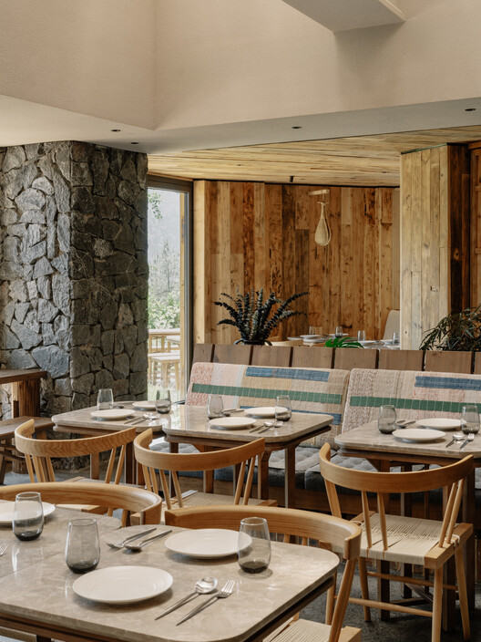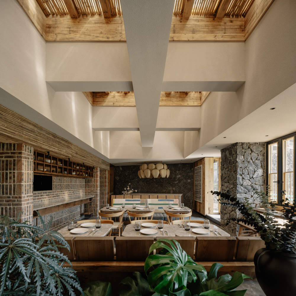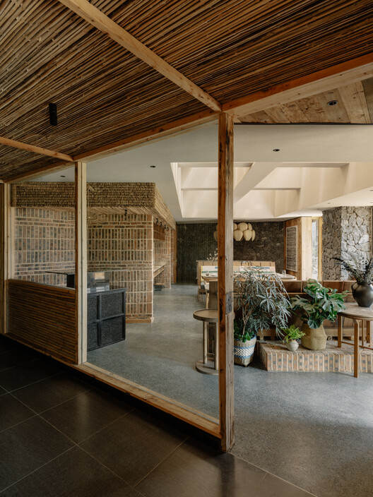 The restaurant is located in the podium on the first floor, gaining interior and outdoor seating layers by extending outward towards the mountain. The space extensively utilizes recycled construction materials, including demolished red bricks, bamboo treads, semi-finished bamboo weaving, and black mountain stones, used for walls, entrance ceilings, reception desks, and terrazzo floors, achieving a balance between locality, cost, and quality.