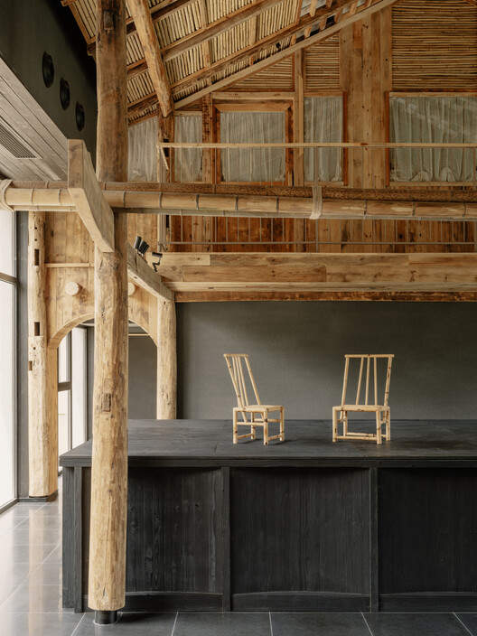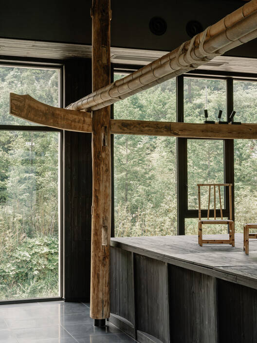The lobby level is set on the top floor of the building, connecting the reception, waiting area, elevator hall, bar, multi-functional stage, and office mezzanine, unfolding panoramic mountain views in all directions. The interior fills the space with materials such as bamboo shoot shells, square bamboo, scrap wood, bamboo weaving, and black mountain stones, giving visitors an experience of being enveloped by the mountain upon entry. The bamboo structure and bamboo painting in the lobby bar were created spontaneously on-site, forming a unique spatial character.