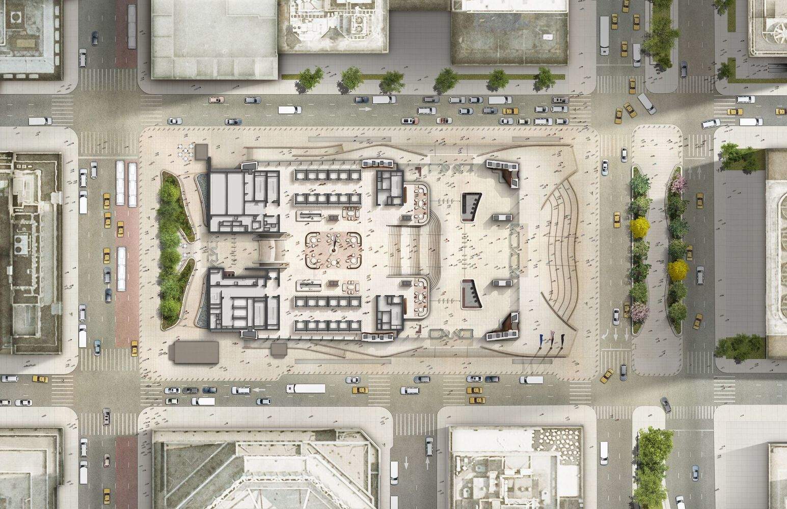 The outdoor spaces provided at the ground level on Park Avenue and Madison Avenue for 270 Park Avenue are 2.5 times larger than the previous building, featuring wider sidewalks, and a large public plaza on Madison Avenue with natural greenery and other amenities designed for the residents, office workers, and visitors who frequent the neighborhood.