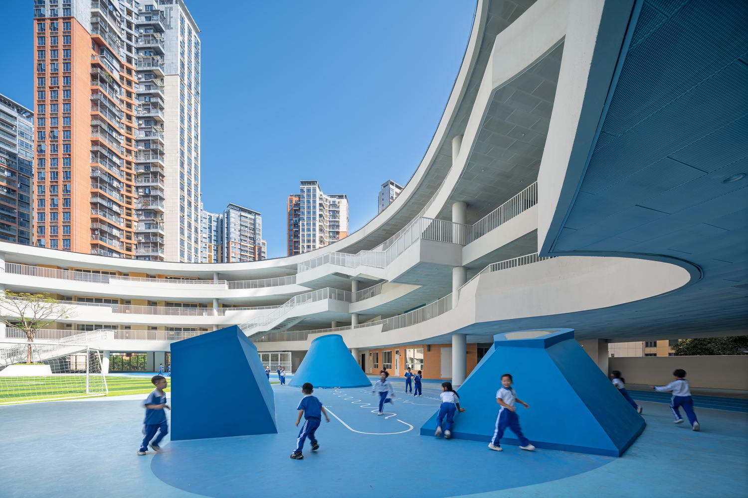 高密度复杂环境下的空间优化与边界重构:项目面对龙岗区住宅、工业园和城中村交织的复杂高密度环境,展示了高超的空间整合能力。特别是针对不规则地块和高楼环伺的挑战,采用“外折内圆”的平面策略,最大化地利用了基地面积,并有效缝合了碎片化的城市肌理。更重要的是,设计策略性地弱化了传统学校的封闭边界,将文体功能置于底层向社区开放,利用中心运动场成为社区公共舞台,实现了书院与社区的共享共营,有效提升了城市公共空间的质量和活力。