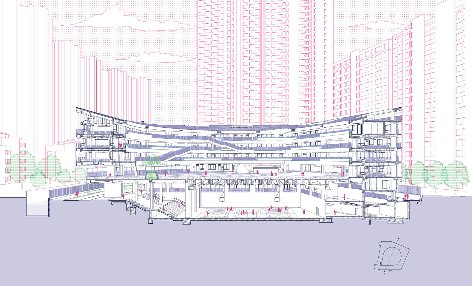 在强调上部围合的同时,将学校与社区可共享的文体功能置于底层。中心大面积的运动场可为社区提供大型活动的舞台空间,增强社区凝聚力。建筑语言从客家民居中汲取灵感,结合本地气候与学校的功能需求,多元的立面语汇回应了高密度校舍在遮阳、通风以及私密性与开放性等方面的问题。