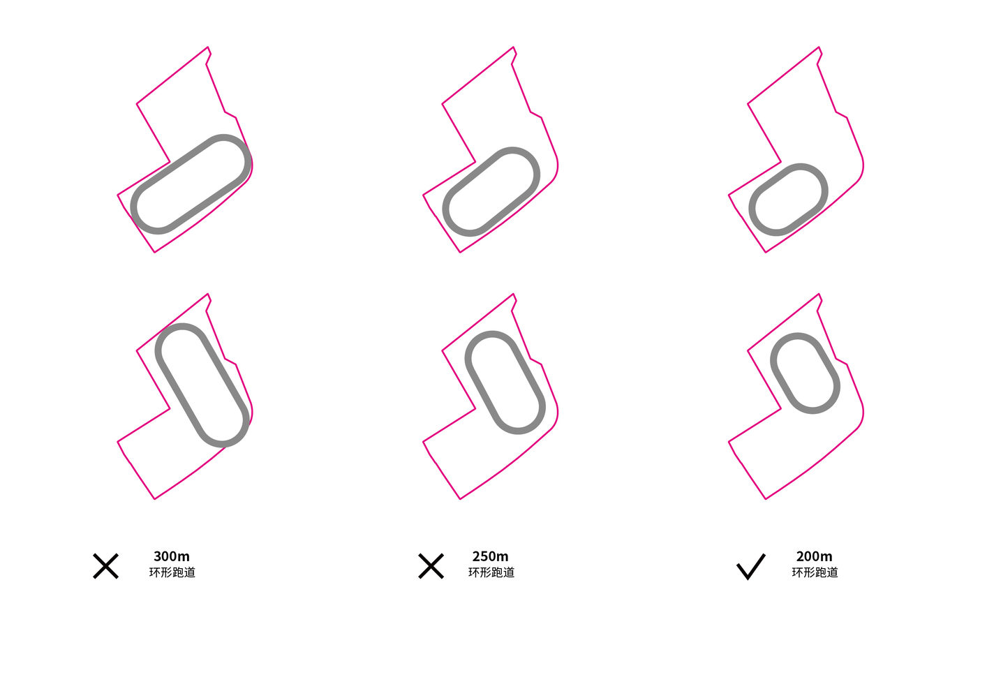 在武宁中学改扩建项目初期,面对用地极度紧张的现实,我们提出了三个不同方向的概念方案:方案1:将 200 米跑道置于地面,建筑整合为连续综合体,布局紧凑但地下室两层,开发量最大,绿化率不达标;方案 2:将运动场抬升至 1.5 层高度,形成三个独立建筑体量,形象鲜明且运动空间便于分时与社区共享。地下开发量较大,建筑密度高,容积率为 1.5;方案 3:同样采用运动场地抬升策略,实现地上容积率最高约 1.85、地下开发量最小,经济性最优。