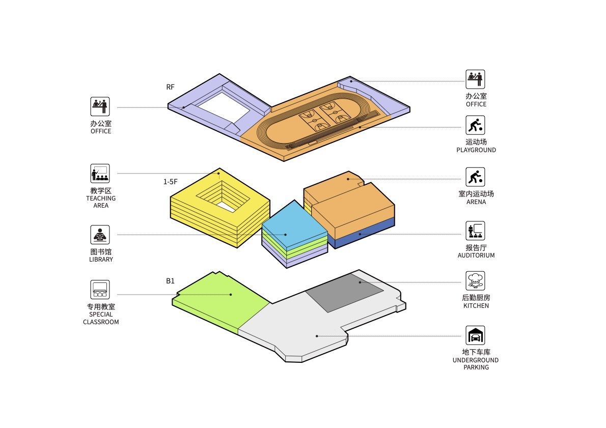 三个体量共同托举起顶部的大屋顶,屋顶西侧主要是行政办公及会议室的使用,而 200 米跑道、器械场地、跳远沙坑、屋顶花园和校园广播站则是布置在屋顶的东侧。为方便学生通往各楼层上课,我们也在教学楼内庭院设置室外楼梯蜿蜒向上通至屋顶活动场地,将地面、各层平台与屋顶大操场串联为一个整体,在打破空间局限、创造丰富活动体验的同时,也承担着重要的疏散功能。