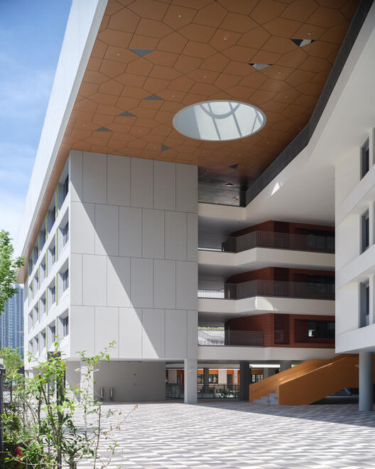 极限场地下的高密度策略与功能复合:本项目最精妙之处在于其对极端受限场地的积极回应。在仅有标准用地三分之一的面积内,设计团队通过抬高运动场地至屋顶、架空底层空间并实现功能组团的紧凑复合布局,成功植入了40个班级的现代化中学所需的所有核心功能。这种“复合集约”的空间策略,将传统平铺的校园平面布局转化为垂直整合的“小型城市群落”,最大化了容积率的同时,巧妙地平衡了高密度开发与必需的公共活动空间需求,是解决城市核心区教育设施用地紧张问题的典范。