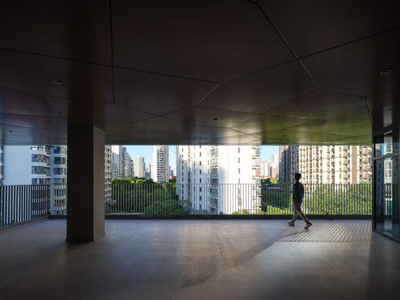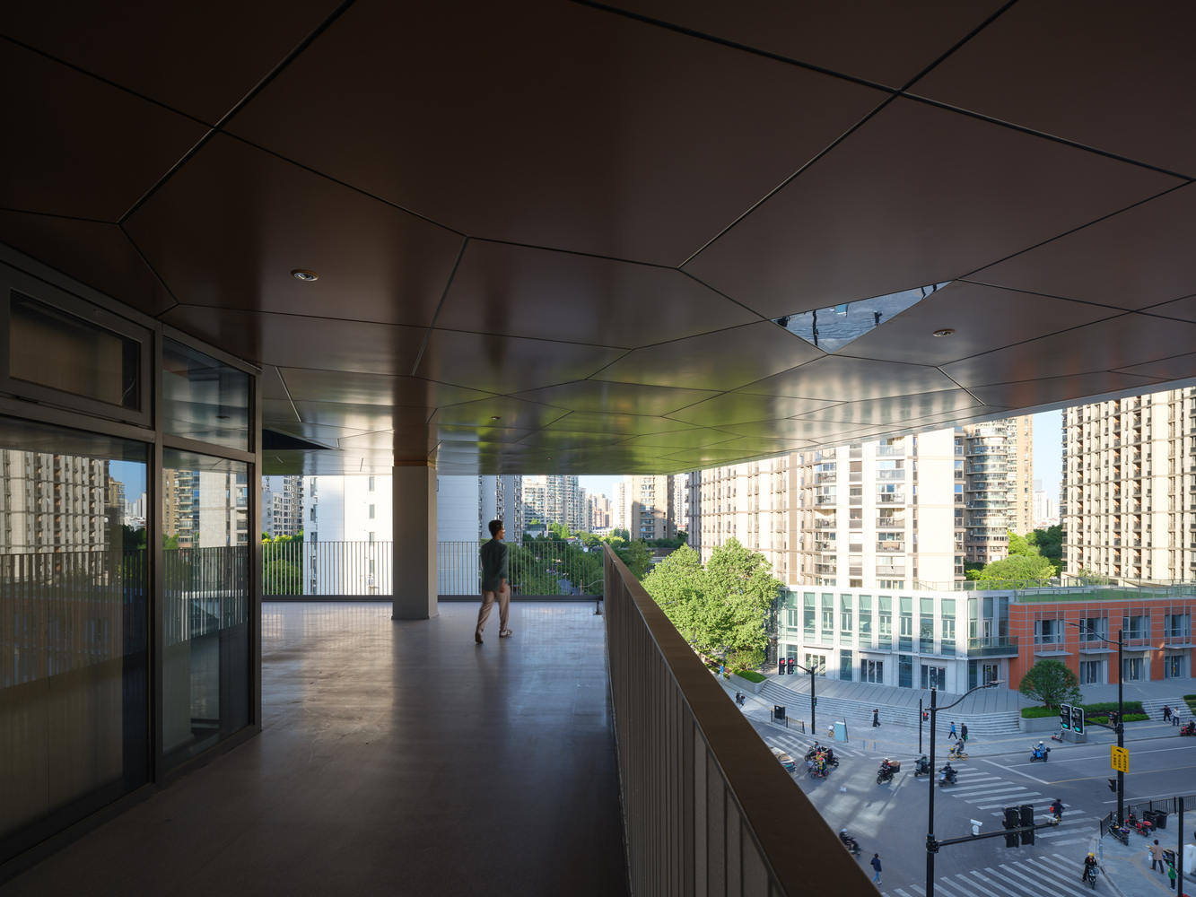 屋顶围栏高度约 7 米,外立面采用金属网格栅,塑造轻盈的漂浮感。从外部看该空间是城市天际线的视觉焦点,凸显了校园的独特个性。