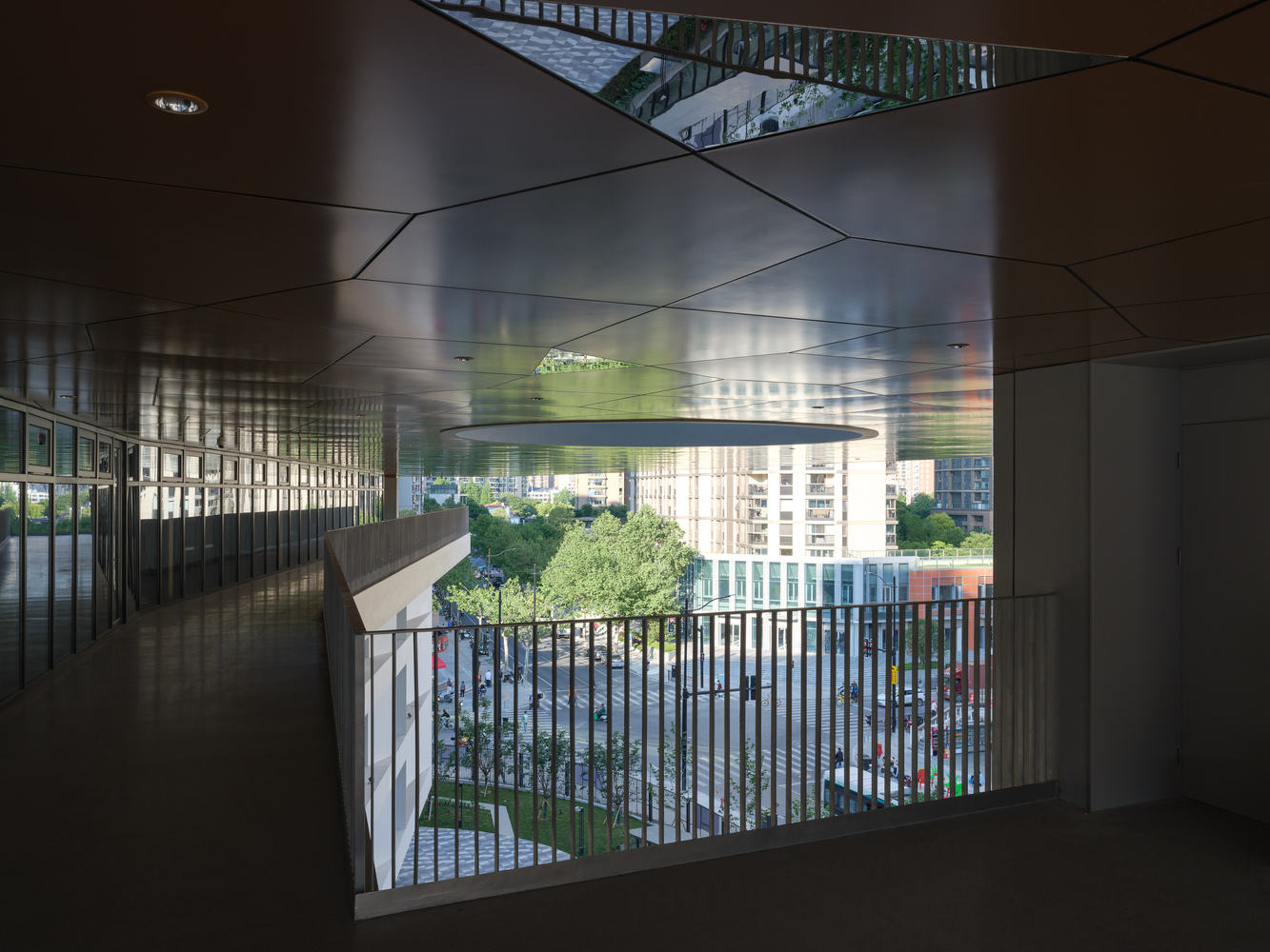 有别于传统封闭的“象牙塔”式校园,武宁中学的设计探索了教育空间与城市社会的开放性连接。通过开阔的走廊设计和局部镜面反射的巧妙运用,把街道景观动态地引入校园,让师生在行走间不经意地捕捉到城市的风景。