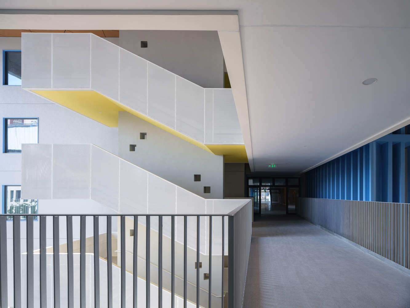 三个组团之间有水平向的交通系统连接,在每层设置室外、半室外平台与连廊,形成立体化的公共活动系统。学生可在课间奔跑、集合、远眺,人均活动面积达 6 平方米,有效缓解高密度校园的活动拥挤问题。