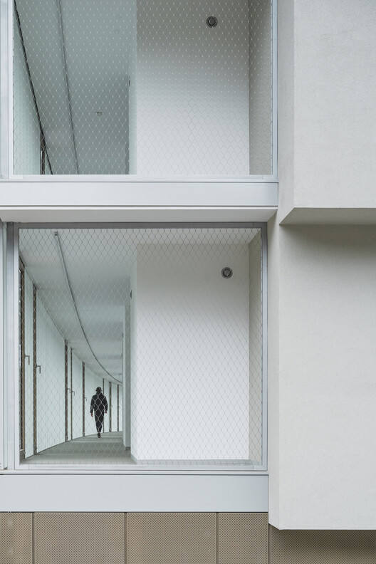 该建筑坐落于地形多样的区域,其形态与周边环境条件相呼应。建筑前部作为沿街的隔音屏障,并自然流畅地过渡至庭院部分,庭院设计顺应了采石场原有岩壁的形态特征,即陡峭的坡面与层层叠叠的台地。建筑风格与当地地形相契合 —— 天然灰泥色调、乳白色玻璃幕墙、流畅的曲线与鲜明的断层相得益彰,再辅以大片的绿植景观,共同营造出一个和谐的整体,彰显出建筑与自然重生的原工业采石场环境的完美融合。景观设计尊重岩壁上的原有植被,保留了部分自然生长的绿植,并通过新增种植来促进生物多样性。这为鸟类、昆虫及小型哺乳动物创造了贴近自然的栖息地,增强了当地生态系统的稳定性。地下车库屋顶的休闲绿色屋顶公园与岩壁上的植被无缝衔接,在建筑群内部营造出宜人的微气候环境。