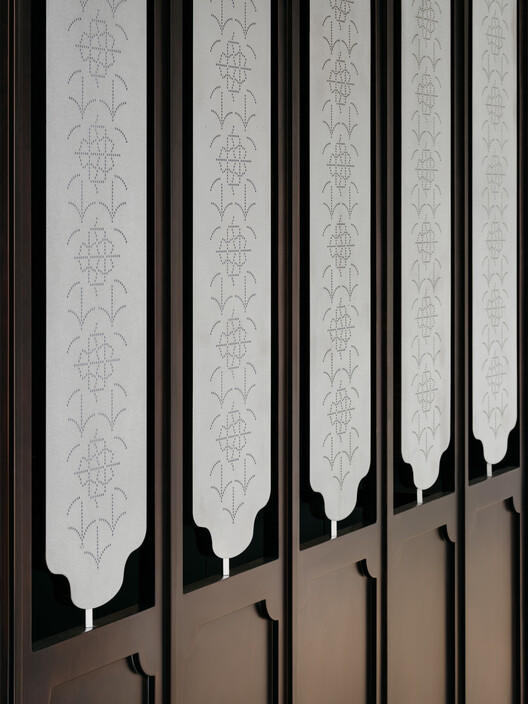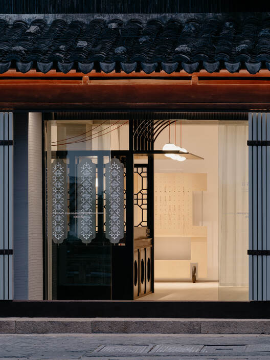 The north side of the "Tang Ming Dan" utilizes reclaimed old wooden door panels from the site. We used a charring process to strip the paint and reveal the grain, transforming them into a warm, wooden base tone. The openwork flower windows were preserved, serving as "cultural remnants" from the previous space; they are not a mere background but become new narrative interfaces. The south side, conversely, employs a contemporary language. We constructed its facade using an industrial material—perforated galvanized steel sheets. The perforation pattern is derived from the "Yiwang" (a curved structure) on Kunqu opera performers' headwear, abstracted and recomposed to form a vague order that is "like tradition yet not tradition." Upon closer inspection, the geometric rhythm of each steel sheet actually originates from the linear strokes of the "Tang Ming Dan" calligraphy.