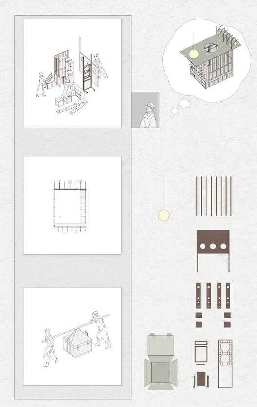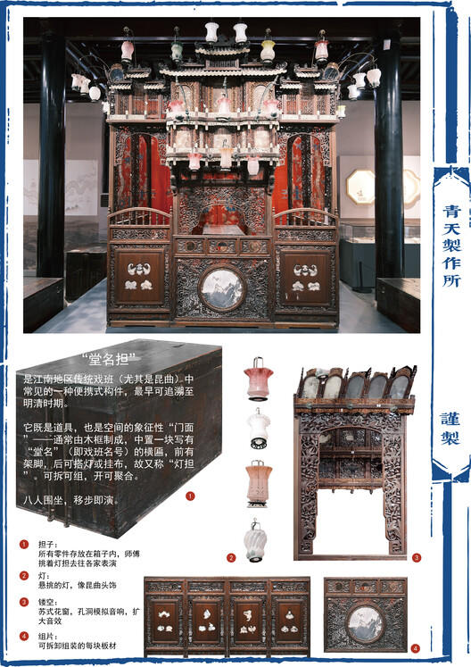我们从一个极小的元素切入:一件常被忽略的博物馆藏品 ——“堂名担”。这是我们介入设计的起点,也是整个空间改造的主轴。“堂名担”是江南传统戏班中使用的便携式门面结构。结构轻巧、可拆可合,是一种“走着演”的舞台机制。这类构件虽然微小,却浓缩了古代戏曲文化的移动性、适应性与组织结构,也体现出舞台精神与民间社会之间紧密的互动关系。我们不复刻它,而是提取其中的逻辑,并转译为当代表达的空间语言。
