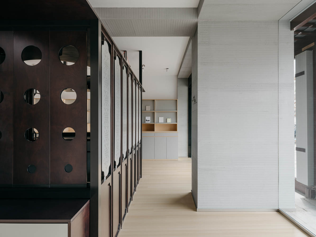 新旧材料的叙事性转译与边界模糊:建筑师通过材料的选择和处理,构建了清晰的空间叙事层次。一方面,对回收旧门板进行炭烧处理,保留了前身空间的“文化残件”——镂空花窗,赋予空间历史的温润肌底。另一方面,南面则采用工业材料穿孔镀锌钢板,其打孔图案抽象提炼自昆曲头面结构及“堂名”书法笔触,形成一种“像传统又不是传统”的模糊秩序。这种新旧材料的并置和转译,不仅丰富了空间的触感和视觉层次,更强化了空间“可再书写性”的理念,强调其作为持续发生文化事件的平台属性。