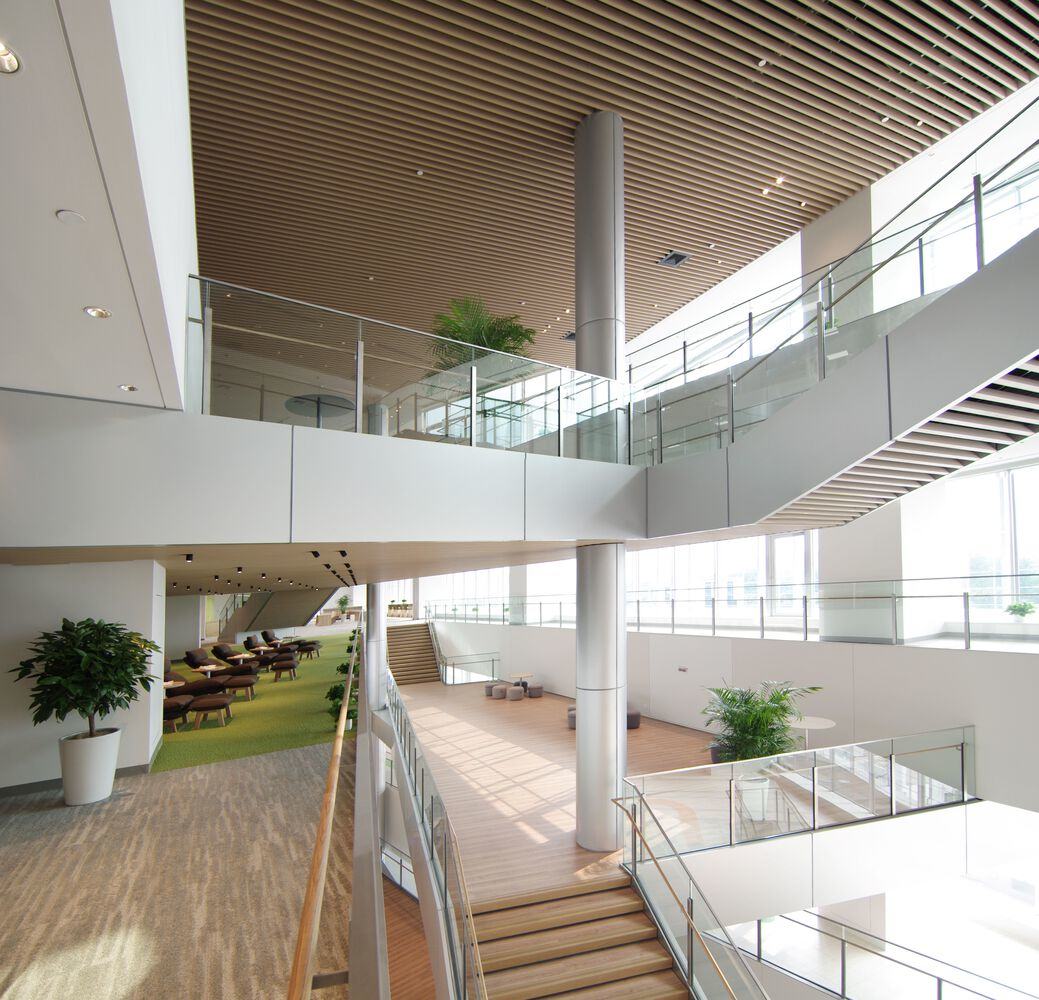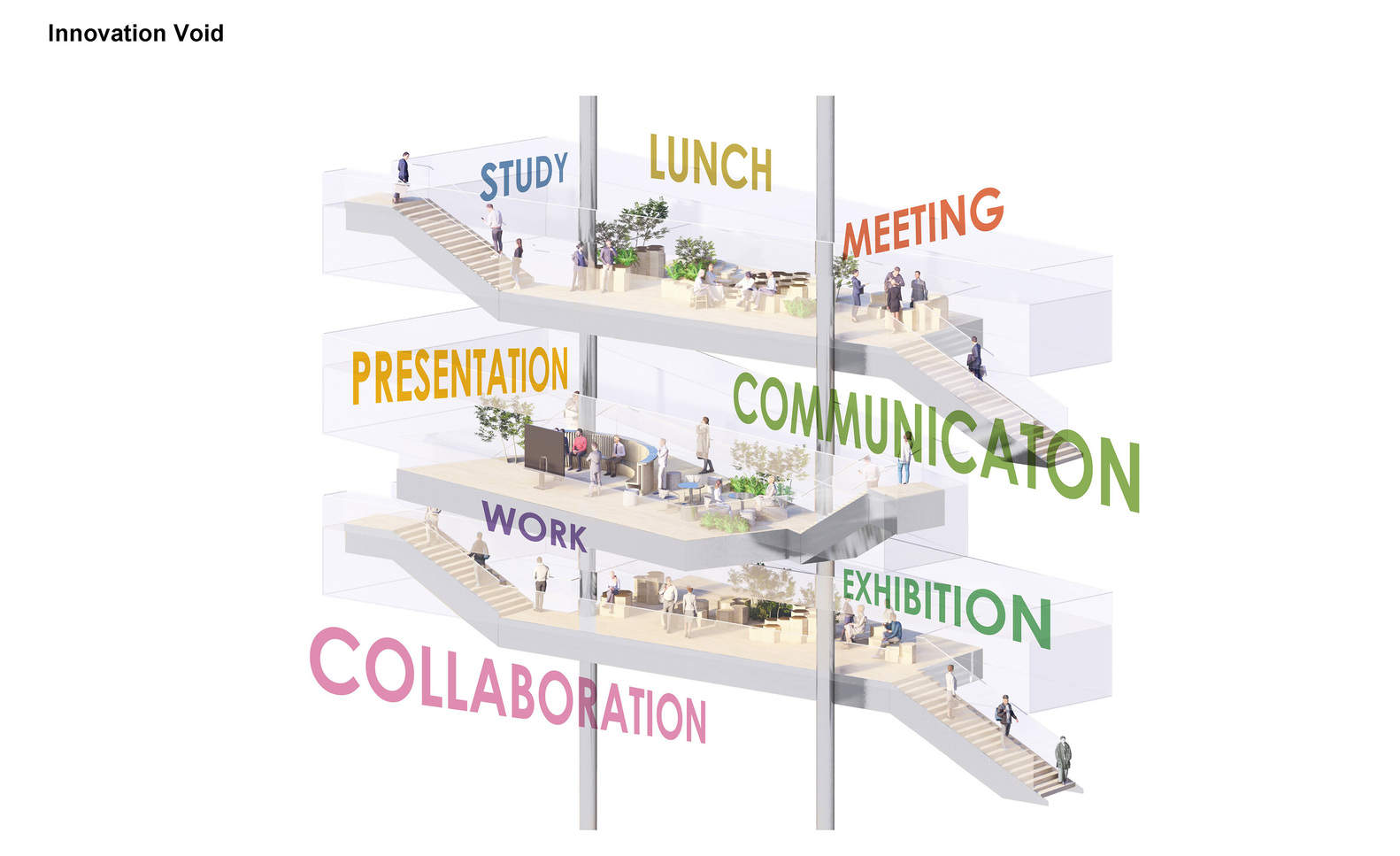 创新共创空间 —— 中庭空间利用连接各楼层的楼梯平台,作为一个共创空间(“创新空隙”),连接业务部门和研究领域。它旨在打造一个舒适的空间,让人们可以像栖息的鸟儿一样聚集在一起,在自然的流动中促进互动。这通过错层平面布局和差异化天花板高度创造多样化的区域和交叉视线来实现,使居住者能够共享愉悦的氛围。