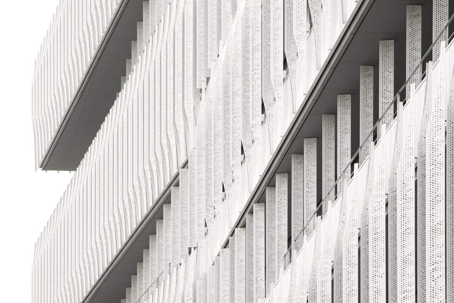 光翼百叶映照环境 —— 建筑独特的光翼百叶采用先进的模拟技术进行了优化,以减少太阳辐射负荷,其设计灵感源自汽车设计中的特征线条。它们体现了移动出行公司应有的先进功能,打造出具有最佳环境性能的标志性外观。为解决西立面午后阳光强烈的问题,采用了计算设计策略,从无数图案中推导出最优解。关键因素包括阳台投影深度、垂直百叶的密度、角度和形状。光翼的穿孔开口将自然光柔和地散射到室内,同时减少眩光,且注重视觉美感。