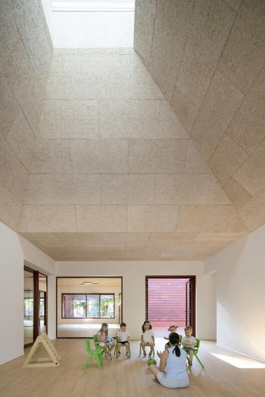 如同村落广场旁的民居,教室亦朝内围合,通过中央“阿戈拉”(agorà,古希腊语意为“集会广场”)形成互动 —— 这是一处供游戏与非正式学习的共享空间。目光由此穿越教室与露台,直抵花园,空间彼此串联,形成绵延的视觉联系。最终,视线向上延伸,抵达顶部的天窗。阳光如日晷般标记时光流转,轻抚过质感丰富的木质天花板,悄然回响着卡索内茅草屋顶的质朴韵律。