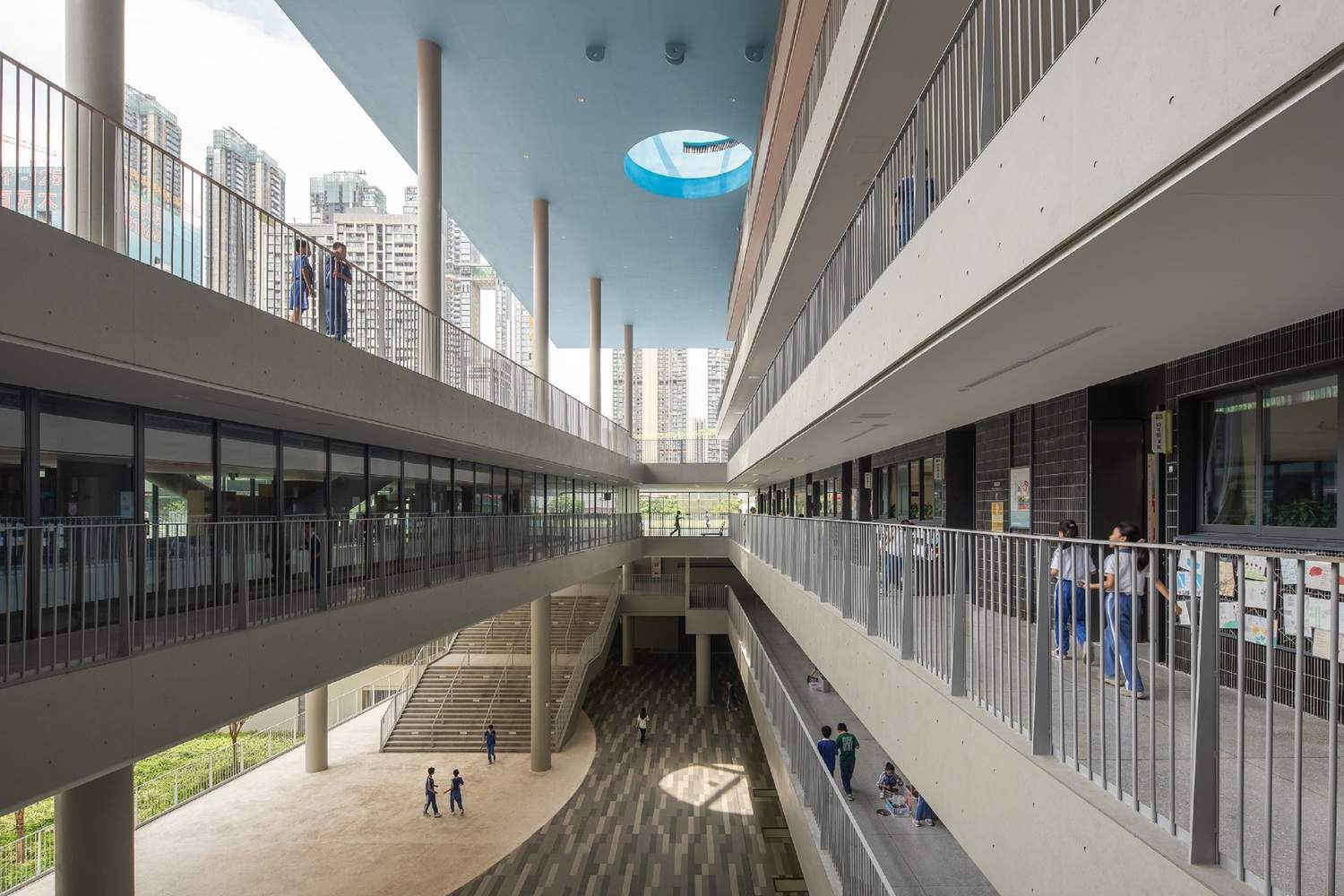中央庭院不仅是视觉焦点,更是学校各类活动的核心舞台。图书馆、报告厅、体育馆、游泳馆、艺术教室、科学实验室等共享功能空间面向庭院开放,使学习从封闭的教室延伸到整个校园。这种布局鼓励跨年级交流、激发偶然相遇与知识碰撞,将“开放教育”理念具象化为可感知、可体验的空间现实。