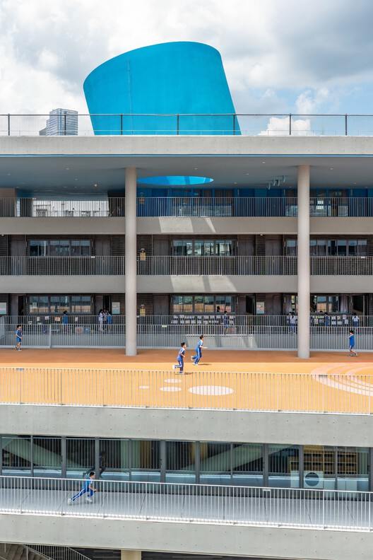 通过水平楼板组织活动空间,强调建筑的水平性,楼板截面整合空调、设备管线,形成一块纯粹的“板”,层与层交错,富有变化。课间十分钟通常被认为是“无法有效利用的碎片时间”,但在绿洲小学,这段短暂的时间被赋予了新的价值。学生只需几步就能从教室来到平台,享受阳光、新鲜空气和短暂的游戏。这种设计深刻理解儿童行为特征 —— 他们需要频繁的休息和活动来维持注意力,而非长时间困在固定座位上。