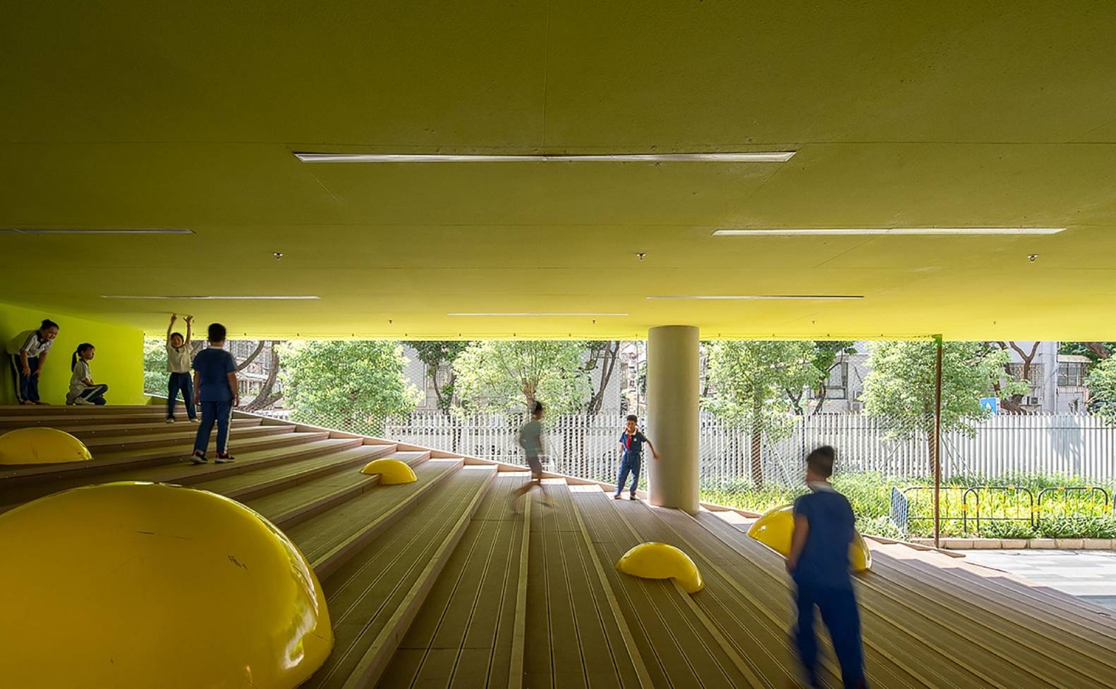 Activity spaces are organized through horizontal floor slabs, emphasizing the building's horizontality. The cross-section of the slabs integrates air conditioning and utility pipelines, forming a pure "plate" that interlocks with others, creating variation. The ten-minute breaks between classes, often considered "unusable fragmented time," are given new value at Green Oasis Primary School. Students can reach the platforms from their classrooms in just a few steps to enjoy sunshine, fresh air, and brief play. This design deeply understands children's behavioral characteristics—they require frequent rest and activity to maintain attention, rather than being confined to fixed seats for extended periods.