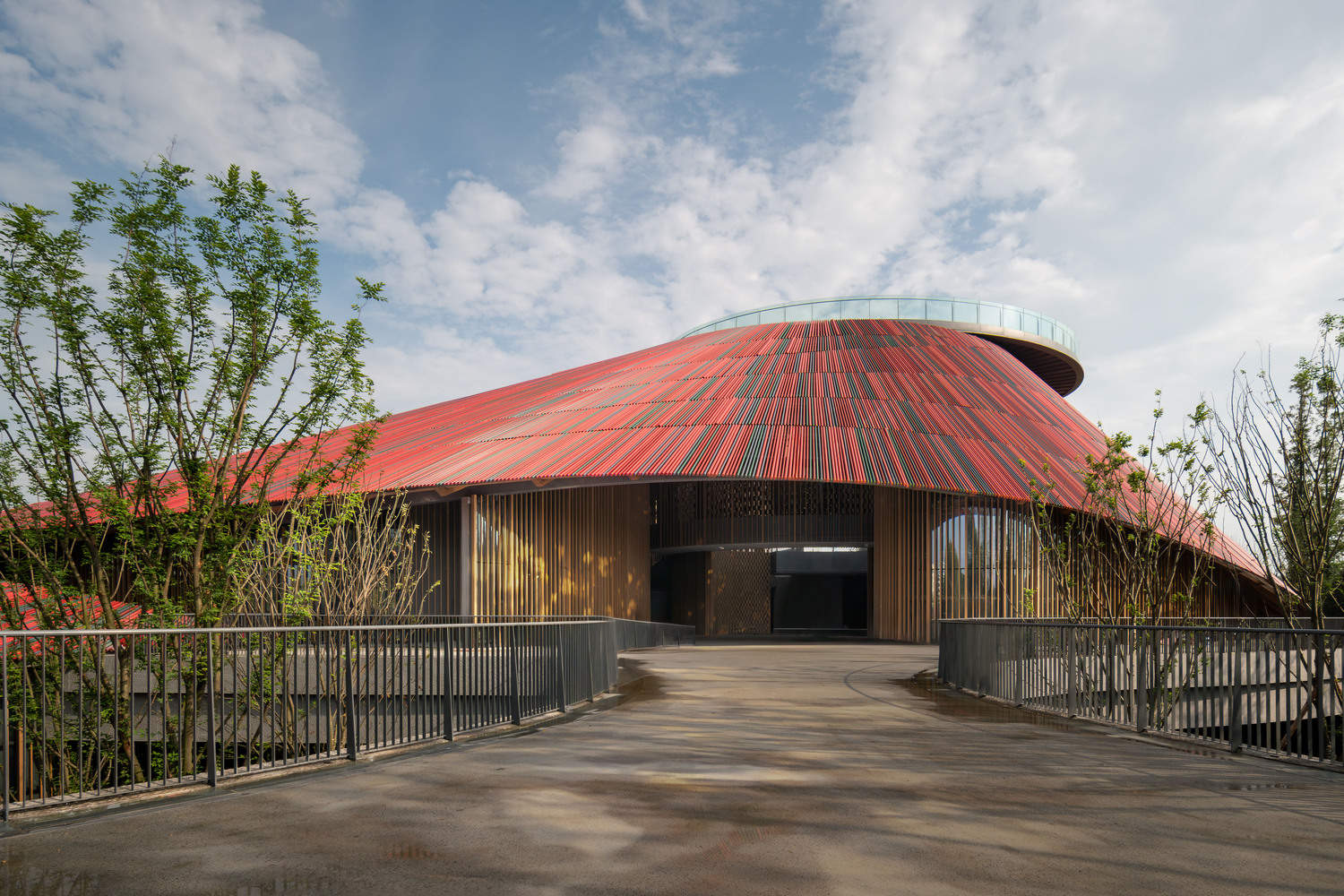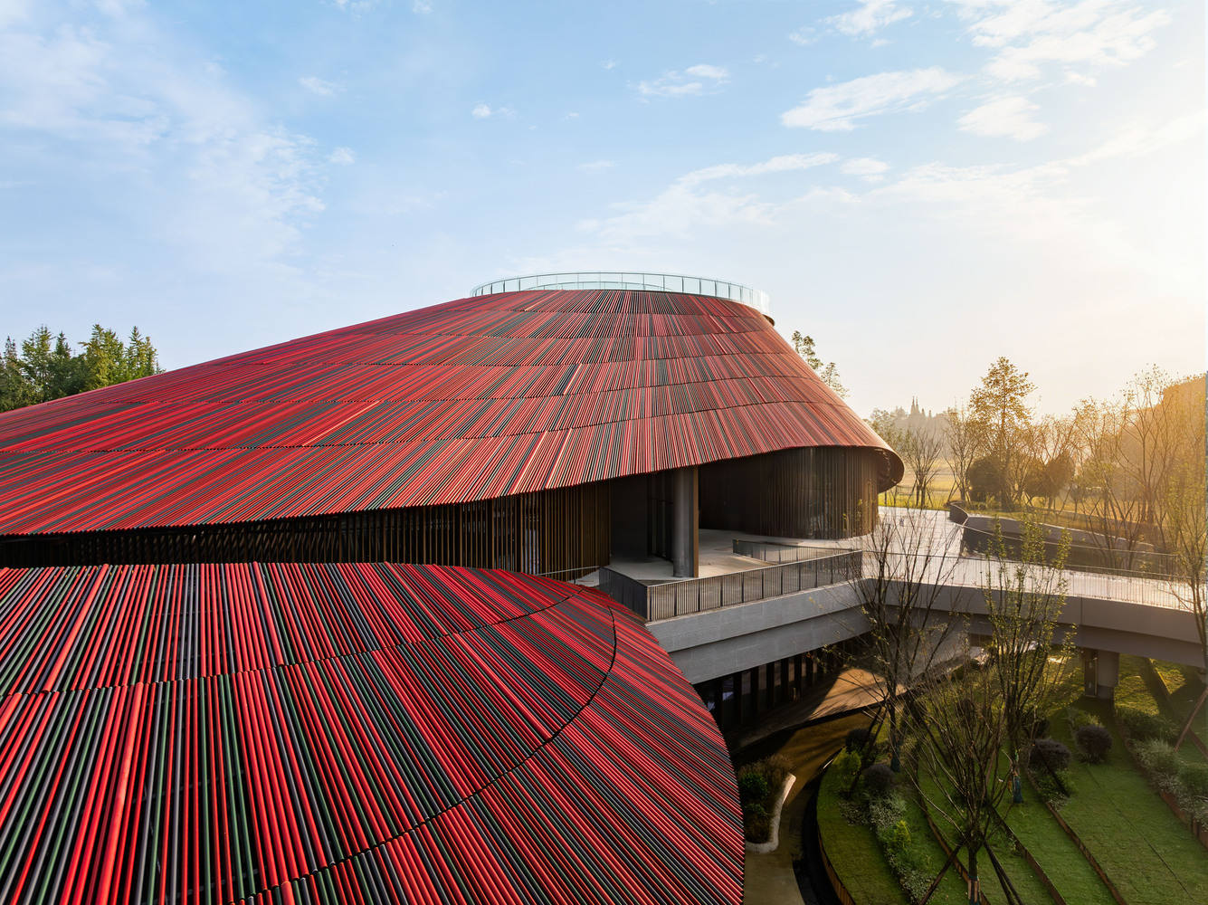 传统意象的当代精妙转译:建筑通过对川西坡屋顶的当代化表达,形成了强烈的在地识别性。三片交错、依循地形起伏的屋顶形态,轻盈地呼应了传统民居的自由造型。更具创新性的是,屋面采用了以“彩椒”为灵感的铝合金圆管系统,随机分布的四种色调(红、深红、墨绿、深灰)不仅模仿了豆瓣和辣椒的自然色彩演变,更在建构层面与内部钢环梁结构精准耦合,使表皮和结构相互强化,实现了传统意象与现代技术、材料的完美融合。