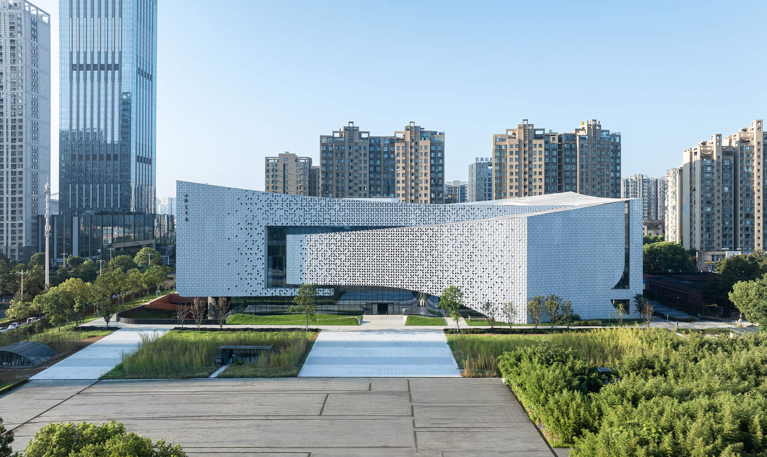 多维体验导向的公共空间策略:设计巧妙地将美术馆定位为一个“全方位的艺术空间和艺术公园”,摒弃了传统单一的文化场馆形象。通过界定“仪、雅、悦、趣”四种界面,建筑的每一面都与周边的城市环境和市民生活产生了差异化且富于情感的互动。从城市主干道的“仪雅”形象展示面,到园区中心的“典雅”体验入口,再到面向居住区的“愉悦”立体公园和街角“趣味”的下沉广场,实现了艺术与城市、公共性与生活性的无缝渗透与融合。
