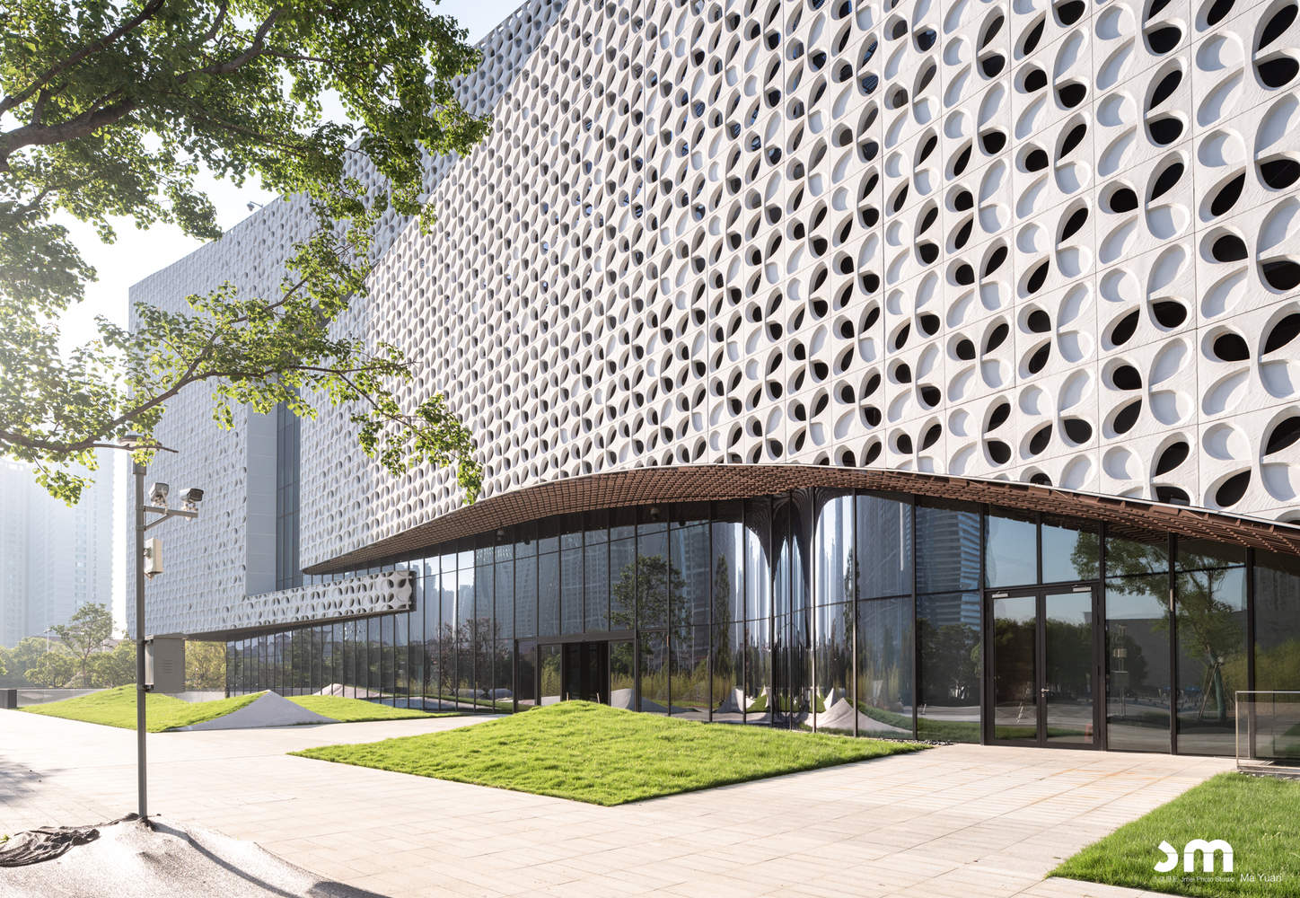 The City's Cultural Carrier — Inheritance of Craftsmanship, City Imprint: Inspired by the Osmanthus, the city flower of Hefei, the scheme abstractly incorporates the essence of techniques like Wushan Iron Engraving and painted gourds to create a set of perforated unit modules for the building envelope. The density of the perforations is set through parameterization, forming a pixelated skin texture. This variation in density simultaneously matches the interior daylighting requirements.