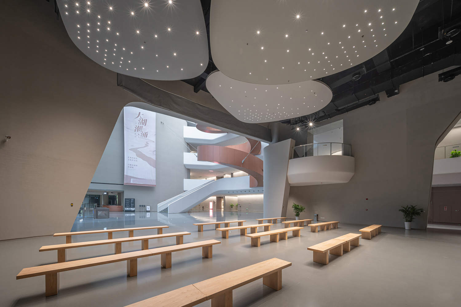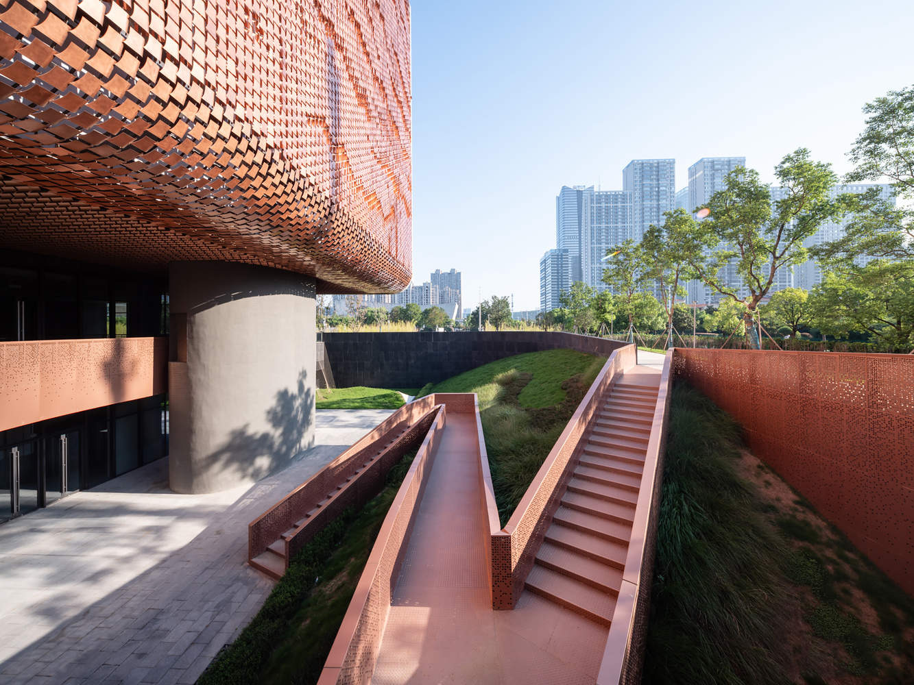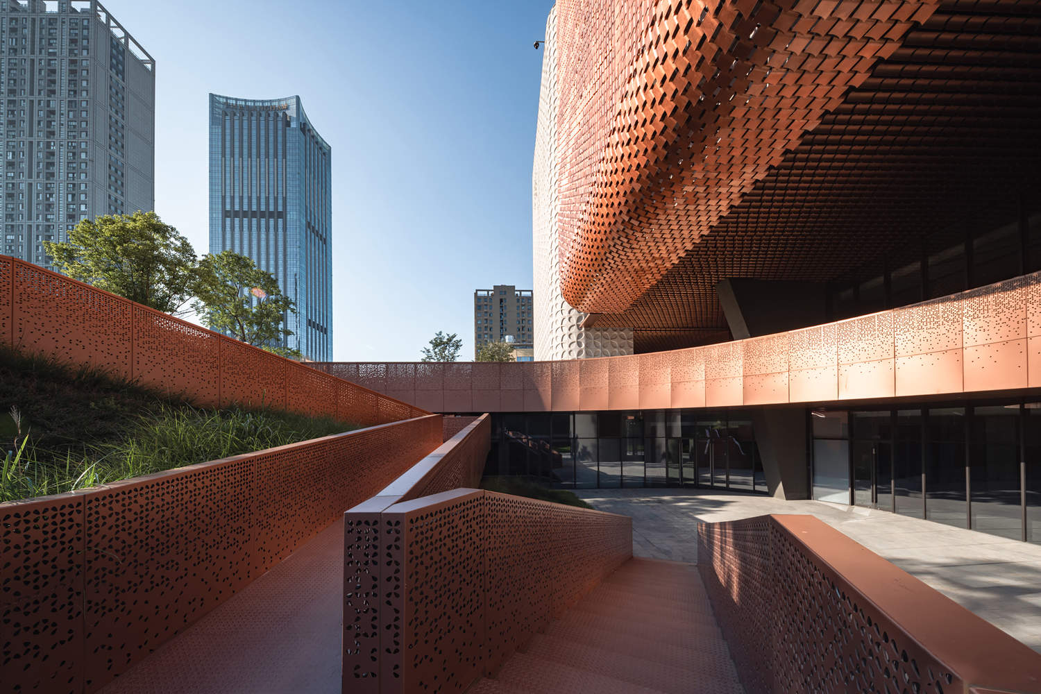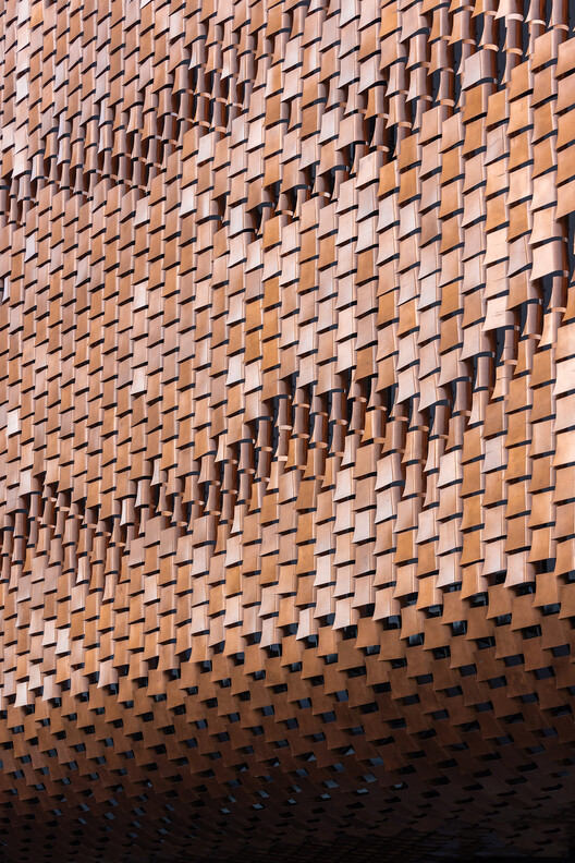 结构创新与表皮的精细化设计:在结构和表皮处理上,项目展现了高超的技术集成能力。内部通过四个巨大的卷曲“筒体”作为结构核心,塑造了流动交汇的公共流线,并结合了独特的桁架和巨型悬挂旋转楼梯,形成了复杂的结构体系。表皮设计则更具匠心,借鉴桂花、烙画葫芦等元素,采用参数化手段设计出具有像素肌理的穿孔模块,这不仅是对传统工艺的现代转译,同时也实现了内部采光与外立面美学的协同优化,体现了设计在技术层面的深度与精度。