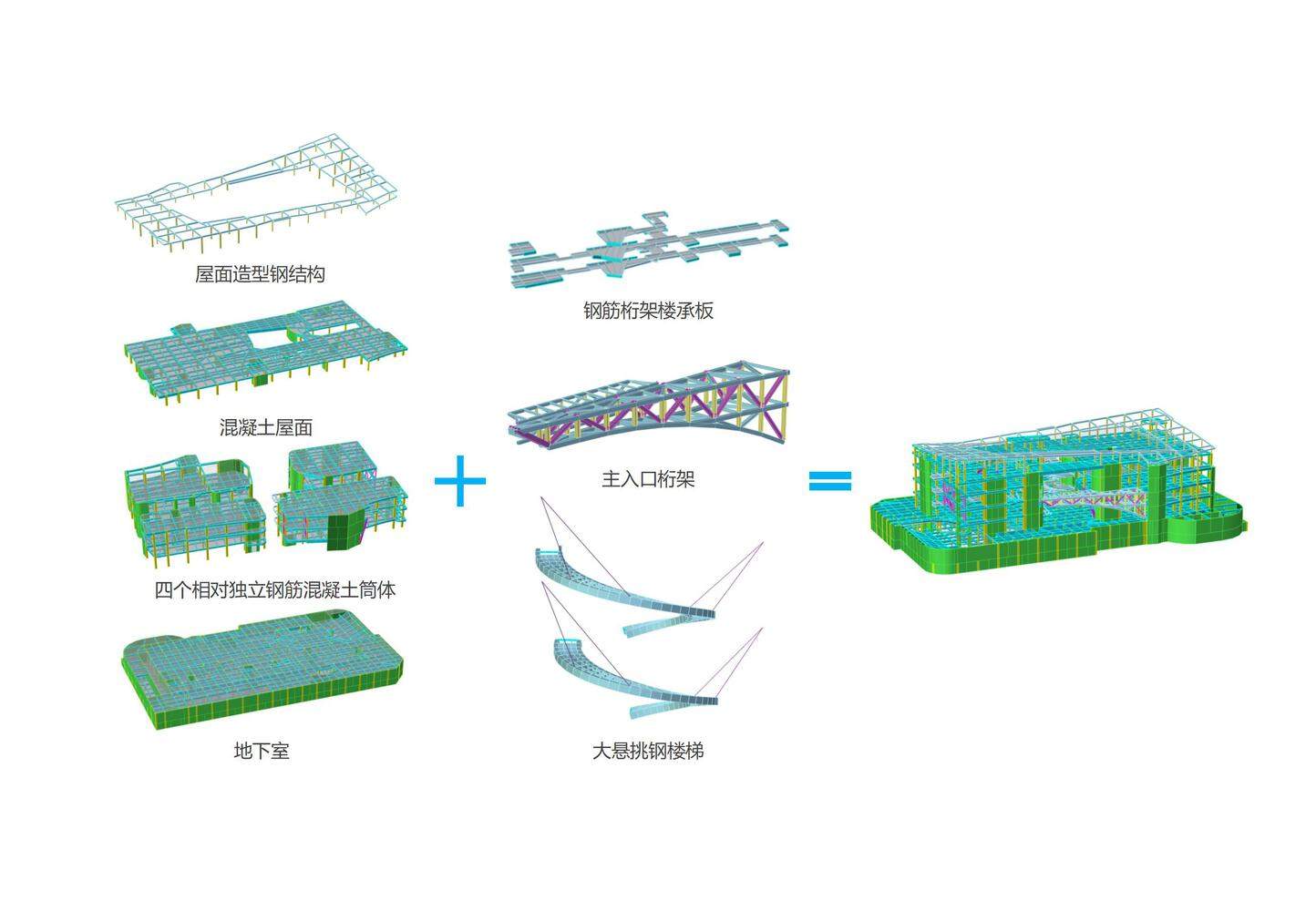 美术馆的内部空间延续归异出同的“流动”与“交汇”的主题,4 个巨大的卷曲“筒体”作为结构核心的同时,又塑造了流动的公共空间 —— 交汇之厅、峡谷游廊。再结合主入口桥式桁架、大尺寸(半径约 6.12 m)悬挂旋转楼梯两个空间-结构亮点,进而形成了“多种类结构构件组合的复杂多层结构体系”。